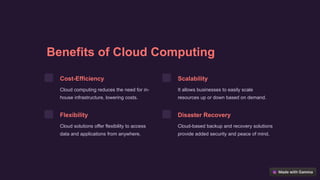 Cloud computing offers organizations scalable and flexible solutions that reduce infrastructure costs and enable seamless collaboration. It emphasizes accessibility and efficiency, allowing businesses to access data and applications from anywhere while easily scaling resources up or down based on demand. The main cloud service models are Infrastructure as a Service (IaaS), Platform as a Service (PaaS), and Software as a Service (SaaS).