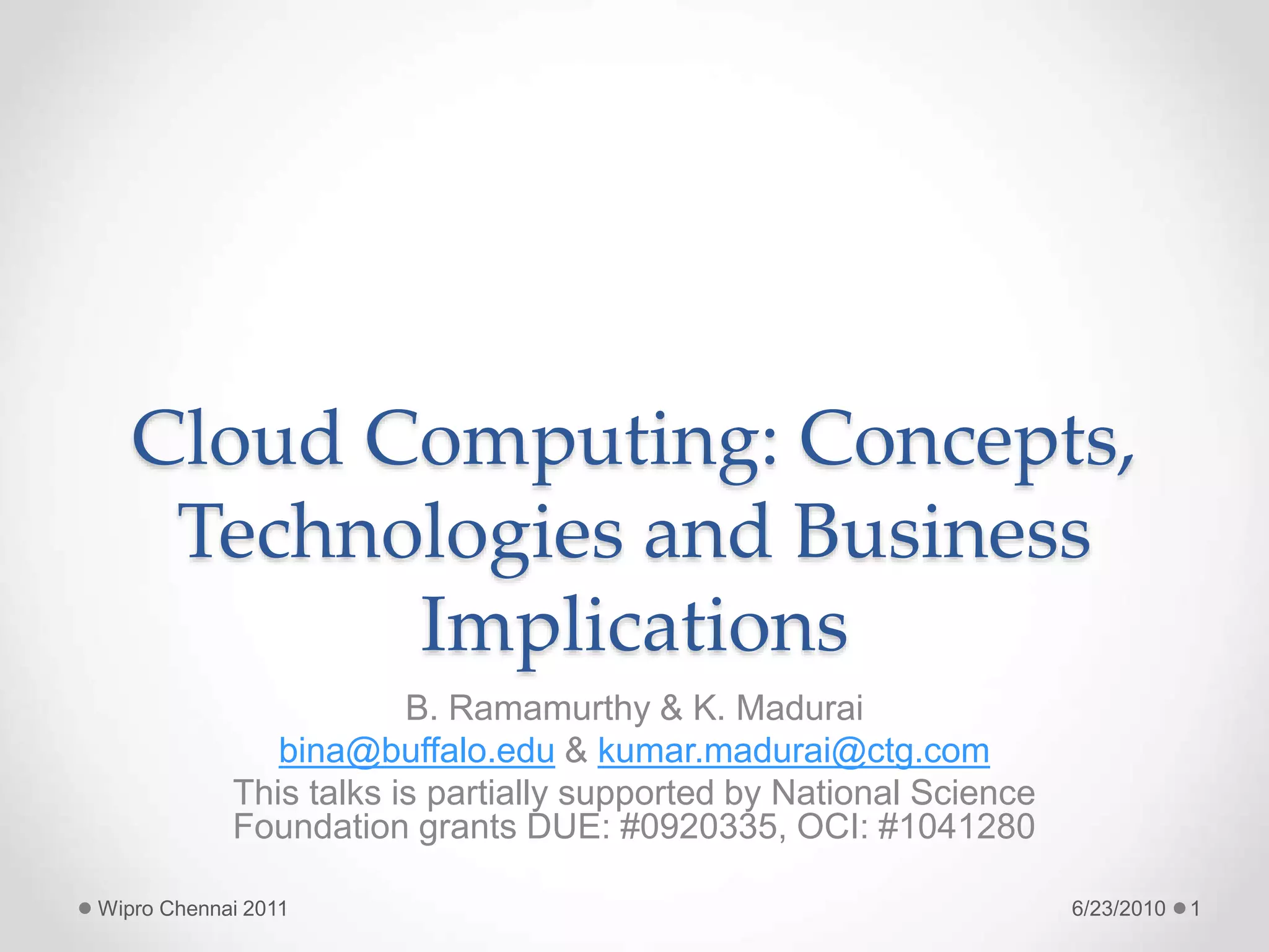 The document discusses cloud computing concepts and technologies. It provides an introduction to cloud models like IaaS, PaaS and SaaS and demonstrates cloud capabilities through examples on Amazon AWS, Google App Engine and Windows Azure. It also discusses the Hadoop distributed file system and MapReduce programming model for large scale data processing in the cloud.