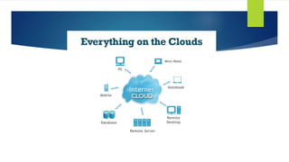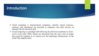 Cloud computing is a model for enabling ubiquitous, convenient, on-demand network access to a shared pool of configurable computing resources (e.g., networks, servers, storage, applications, and services) that can be rapidly provisioned and released with minimal management effort or service provider interaction. Key characteristics of cloud computing include on-demand self-service, broad network access, resource pooling, rapid elasticity, and measured service. Commercial clouds provide infrastructure, platforms and software as services allowing users to access technology resources without owning them.