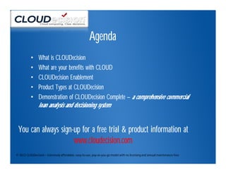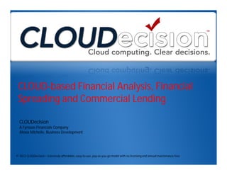 Cloudecision is a cloud-based financial analysis platform offering a pay-as-you-go model for commercial lending and financial spreading with no licensing or maintenance fees. It provides various solutions including loan origination, consumer finance applications, and portfolio analysis, all accessible online. Users can start with low monthly fees and scale their services according to business needs while benefiting from high security and easy access.