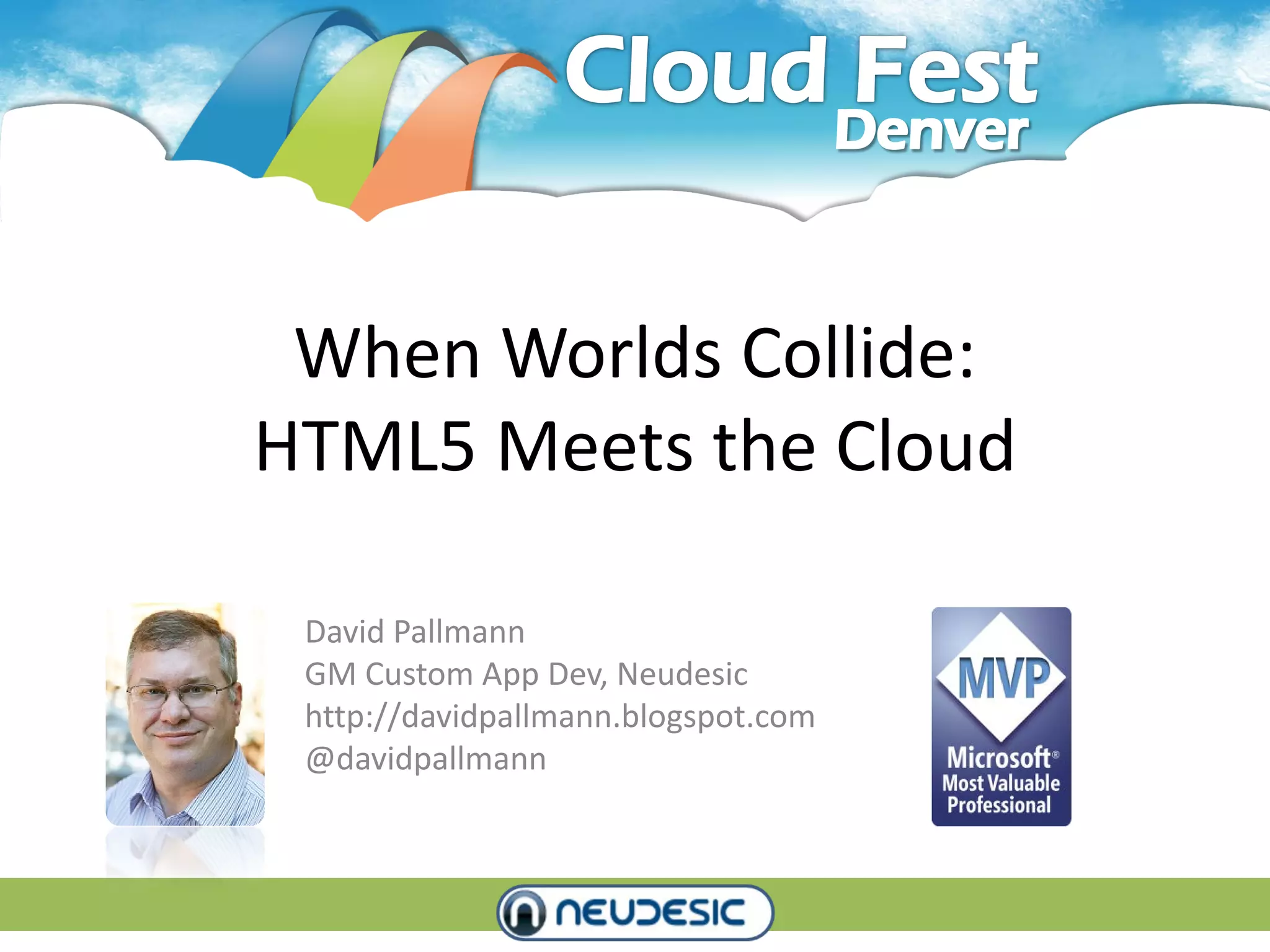 The document discusses how HTML5 and cloud computing enable new types of mobile and global web applications. It describes how HTML5 allows for richer front-end experiences across devices, while the cloud provides elastic, globally distributed backends. The synergies between HTML5, responsive design, and cloud services are explored, including examples of using location data, social integration, and responsive layouts in a mobile and global application architecture combining HTML5, Azure cloud services, and a responsive template-based front-end.