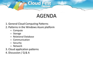 This document outlines various design patterns for building applications on the Windows Azure platform, including patterns for compute, storage, databases, communication, security, and networking, providing examples of how to implement roles, virtual networks, content delivery networks, and other patterns within the Windows Azure environment.