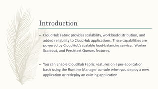 CloudHub Fabric enhances scalability, reliability, and workload distribution for applications, utilizing features such as scalable load balancing and persistent queues. Users can enable these features through the runtime manager console, which requires a CloudHub enterprise or partner account. Persistent queues ensure message delivery and security, enabling communication between multiple workers and facilitating parallel processing, while providing runtime visibility and encryption options.