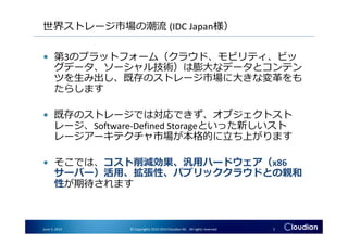 第3のプラットフォーム(クラウド、モビリティ、ビッ グデータ、ソーシャル技術)は膨大なデータとコンテン ツを生み出し、既存のストレージ市場に大きな変革をも たらします • 既存のストレージでは対応できず、オブジェクトスト レージ、Software-Defined Storageといった新しいスト June 3, 2014 © Copyrights 2010-2014 Cloudian KK. All rights reserved. 2 レージ、Software-Defined Storageといった新しいスト レージアーキテクチャ市場が本格的に⽴ち上がります • そこでは、コスト削減効果、汎用ハードウェア(x86 サーバー)活用、拡張性、パブリッククラウドとの親和 性が期待されます
