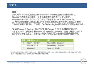 概要 クラウディアン株式会社と日本テレマティーク株式会社の2社は共同で、 Cloudian®の新たな利⽤シーンを⾒出す取り組みを⾏っています。 Amazon S3 へのクラウドバックアップ機能をもつ CA ARCserve ®と S3 APIに完全準拠したCloudian ®との相互連携検証を昨年から実施しており、 この検証結果に基づき、この度、CA Technologies様から公式に認定されました。 CA ARCserve ® Backup および CA ARCserve ® D2D の2製品において、 r16 と r16.5(2月26日 新リリース)を利⽤のユーザは、当社で確認した以下 のオブジェクトストレージをバックアップ先として利⽤する事が可能です。 項番 対象ストレージ 備考 1 ニフティクラウド Powered By Cloudian® 2 クラウド・エヌ Powered By Cloudian® 3 Cloudian® Version 2.2 以降 ニフティの「ニフティクラウドストレージ」及び NTTコミュニケーションズの「Biz ホスティング Cloudn (クラウド・ エヌ) Object Storage」にはCloudian ®が採⽤されています。 © Copyright Cloudian KK and Inc, 2013 All rights reserved 2