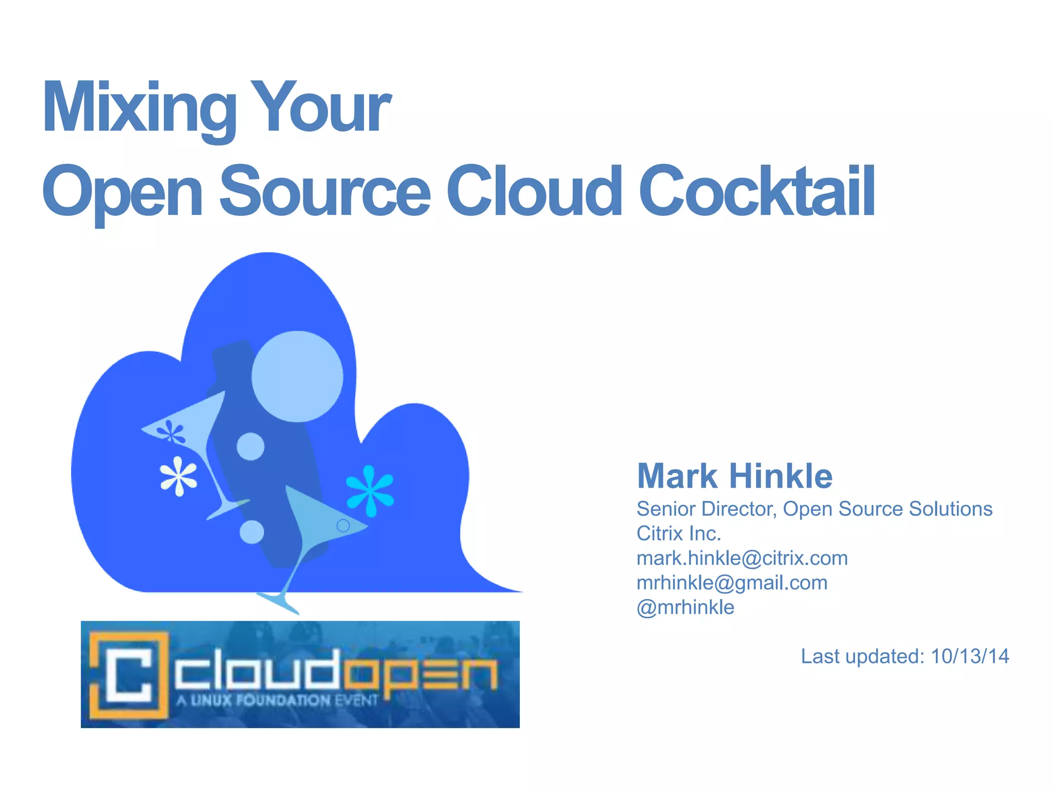 This document provides an overview of Mark Hinkle's presentation on mixing open source cloud technologies. The presentation covers topics like vetting open source cloud projects, infrastructure as a service platforms like OpenStack, container technologies like Docker, platform as a service options, software defined networking, and various related open source projects. The goal is to help people understand how to evaluate and integrate different open source cloud components.