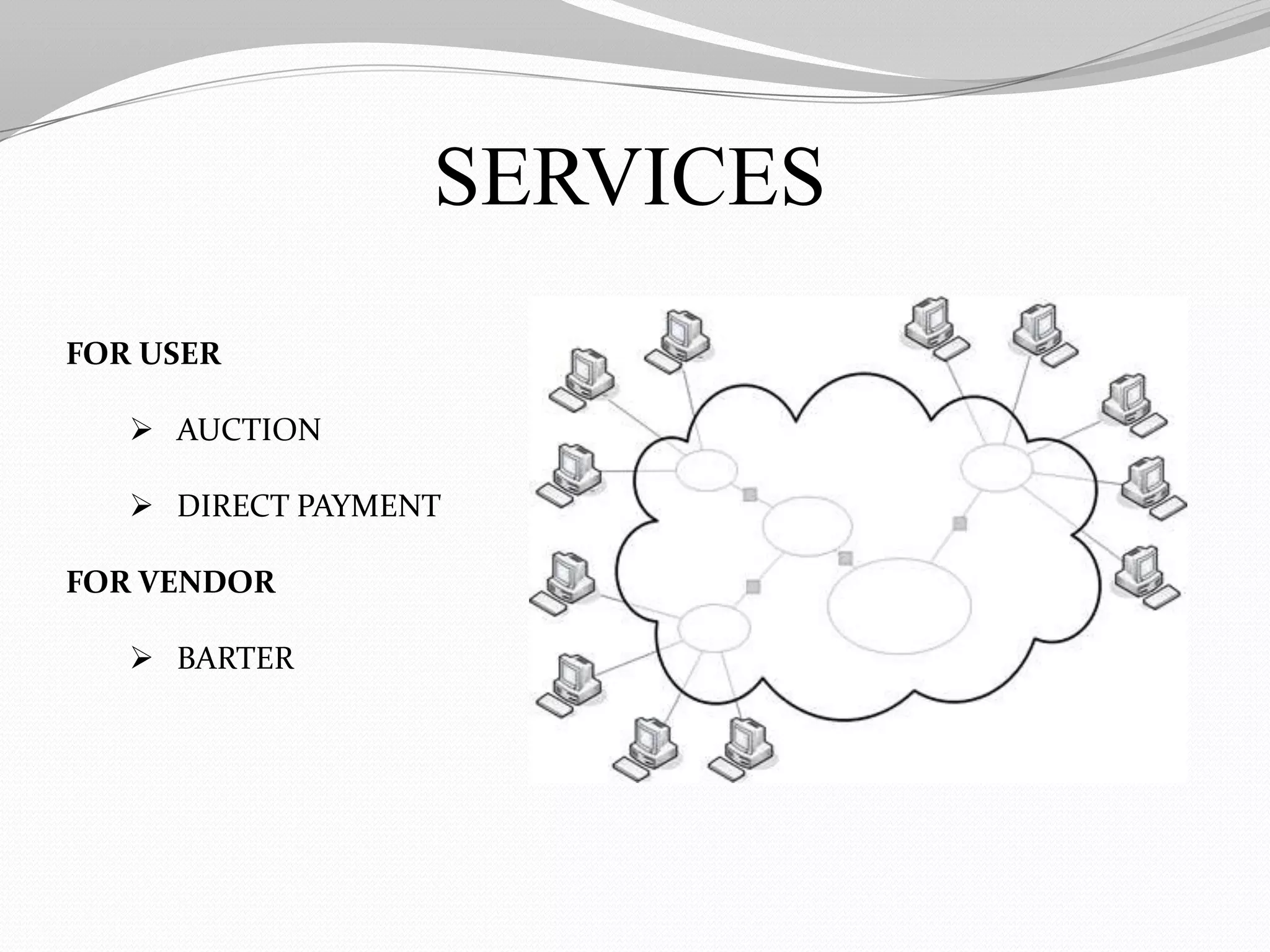 This document discusses different payment options for users and vendors of an auction platform, including auctions, direct payment, and barter. It outlines the auction process, noting products are evaluated based on factors like search frequency and reviews, and higher rated products are auctioned to make more profits while others allow direct payment. The document also lists advantages of cloud computing like lower costs, improved performance and unlimited storage, along with disadvantages around security, control and bandwidth costs. It predicts more small and medium firms will use cloud services while large companies may build private clouds, and outlines a potential software implementation project.