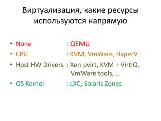 Документ описывает библиотеки и фреймворки для построения облачной инфраструктуры, включая использование различных технологий виртуализации и управления образами. Он также освещает взаимодействие с API, создание виртуальных машин и настройку сетей в контексте облачных решений. Кроме того, упоминаются инструменты для мониторинга, балансировки нагрузки и автоматизации развертывания.