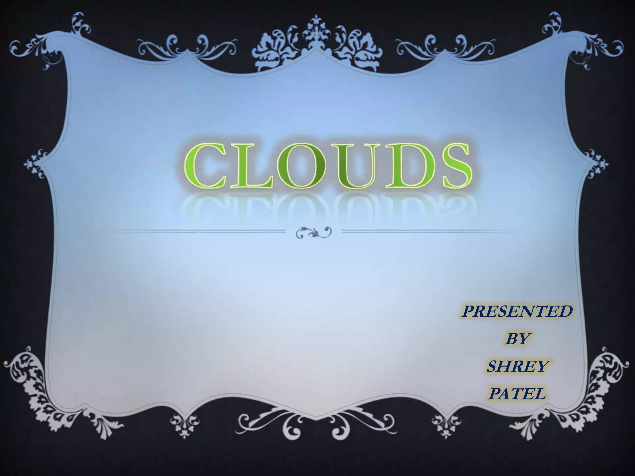 Clouds form when water vapor condenses on particles in the air. The World Meteorological Organization classifies clouds into 10 genera based on their altitude and appearance. Low clouds have a base below 6,500 feet and include stratocumulus, stratus, cumulus, and cumulonimbus clouds. Medium clouds have a base between 6,500-20,000 feet such as altocumulus, altostratus, and nimbostratus. High clouds have a base over 20,000 feet like cirrus, cirrocumulus, and cirrostratus clouds. Each cloud type has distinct characteristics that determine its classification.
