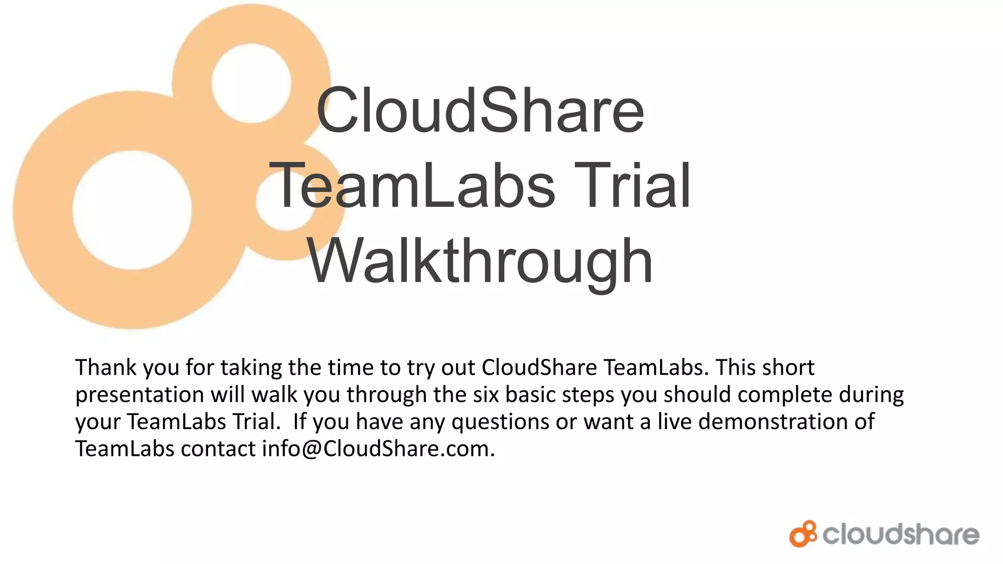 This document provides a six step walkthrough for a CloudShare TeamLabs trial: