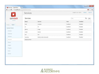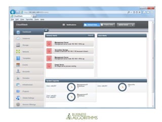 This document compares the architectures, installation processes, administration tools, security features, and high availability capabilities of CloudStack, Eucalyptus, and OpenStack. CloudStack has a monolithic controller architecture and the easiest installation process. Eucalyptus closely mimics AWS but has a more difficult multi-component installation. OpenStack is the most fragmented with many interdependent pieces and a challenging installation. All three provide basic security through VLANs and firewalls, with Eucalyptus and OpenStack adding additional authentication. High availability varies by platform, with CloudStack using a load-balanced controller, Eucalyptus relying on component failover, and OpenStack's Swift storage using replication across its ring topology.