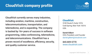 CloudVisit is a remote inspection and collaboration software designed to enhance real-time interaction between onsite technicians and remote experts across various industries. The platform features tools for video conferencing, checklist creation, data collection, and project management, ultimately improving operational efficiencies, reducing costs, and ensuring quality control. By utilizing CloudVisit, businesses can modernize their operations, improve customer satisfaction, and achieve rapid return on investment.
