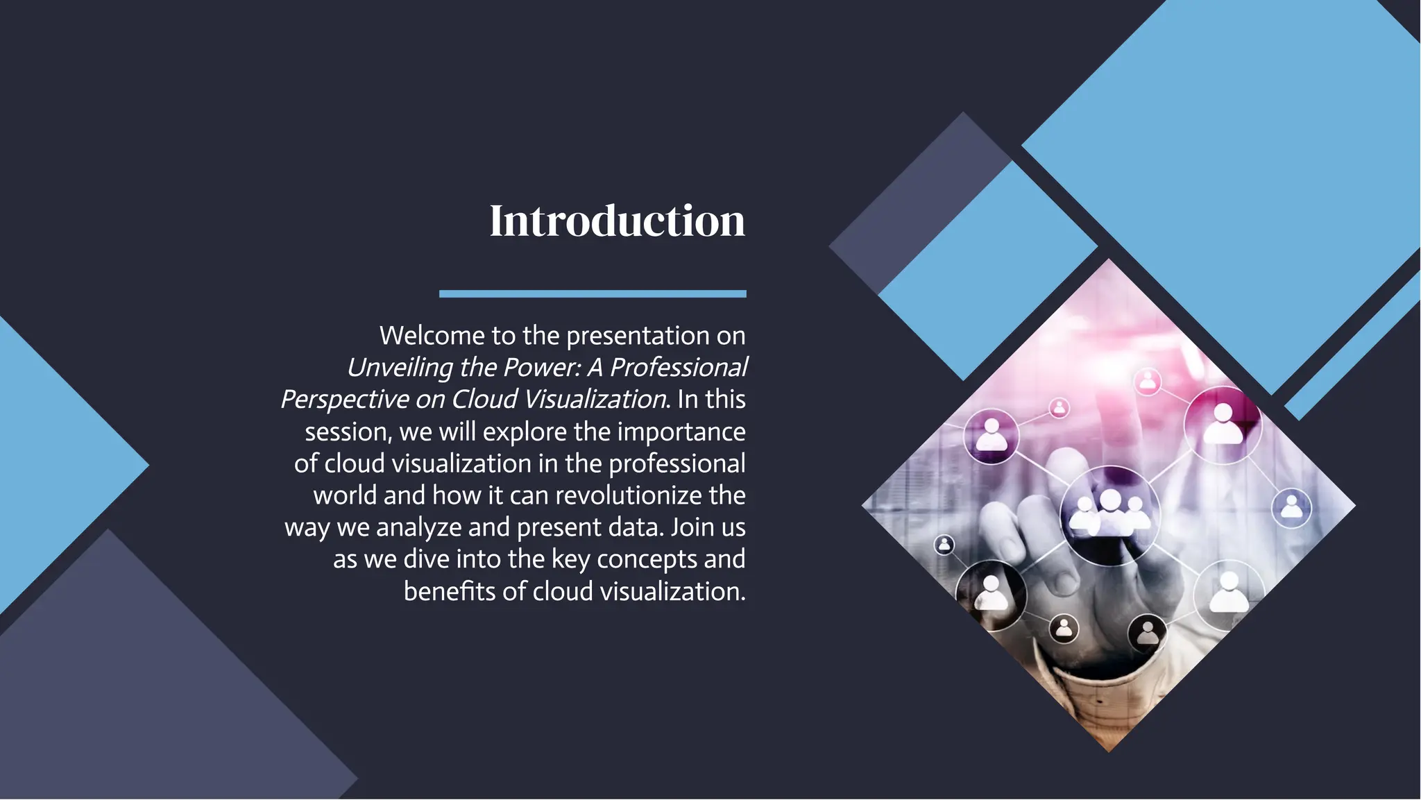 This document presents an overview of cloud visualization. It begins by introducing cloud visualization as using cloud computing resources to create visual representations of data. This allows professionals to gain insights and make informed decisions from complex datasets. The document then discusses key benefits like real-time collaboration, scalability for large datasets, and improved productivity. Best practices are also covered, such as data security, integration, and intuitive interfaces. Finally, the document concludes by stating that embracing cloud visualization can unlock data potential and enhance professional work.