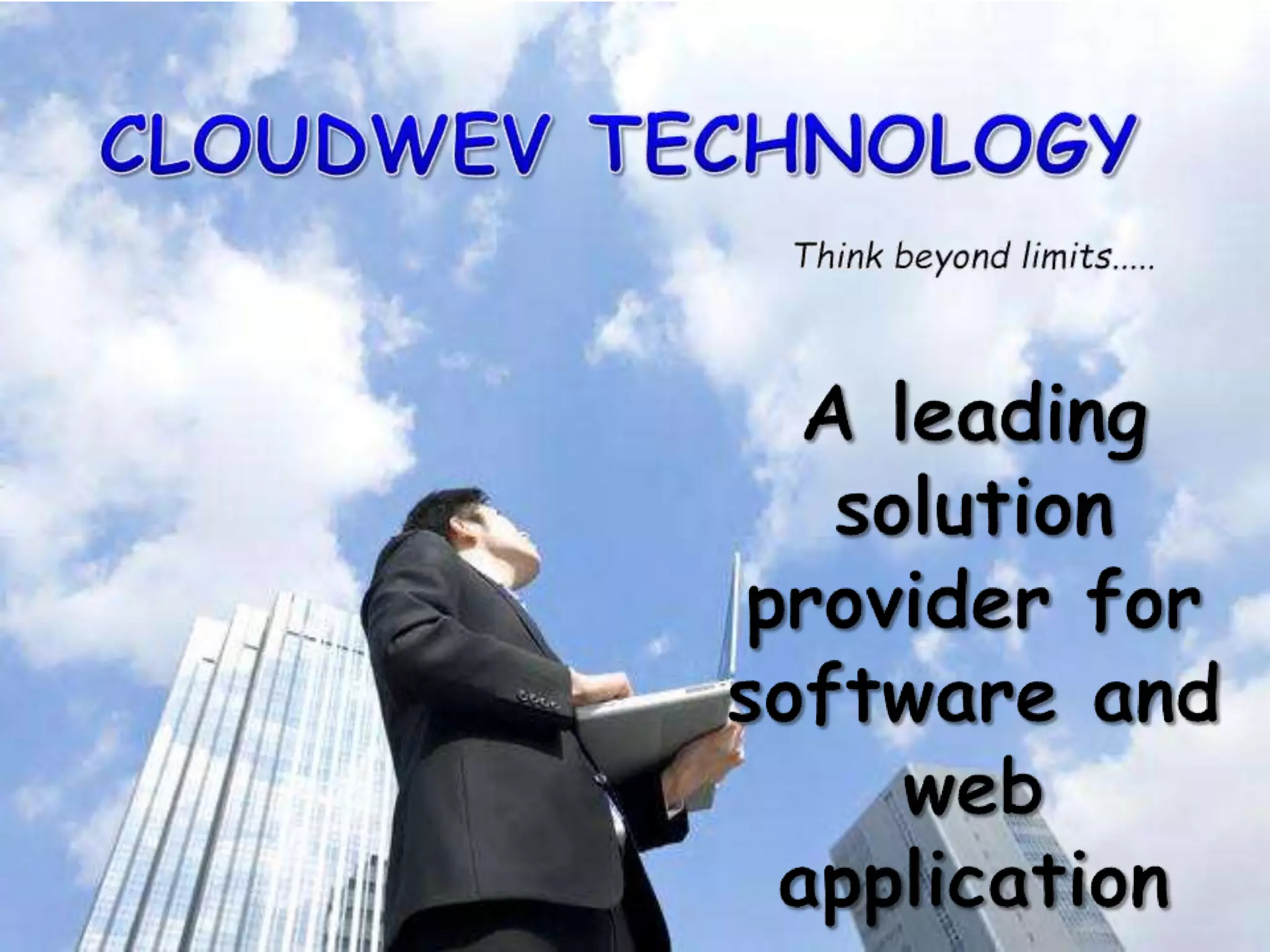 Cloudwev is a company that provides web application and software solutions through web design, development, and consulting services. It aims to introduce India's regional languages through information technology. Cloudwev has experienced professionals and provides end-to-end solutions including .NET, PHP, Java, mobile applications, portal development, and software development. It focuses on creating customized websites and applications to meet customer needs within budget and schedule.