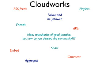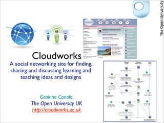 Cloudworks is a social networking site for sharing and discussing learning and teaching ideas and designs. It allows users to find, share, and comment on resources including learning and teaching ideas, designs or case studies, questions or problems, and tools. The site contains many repositories of good practice but developing an active community is important.