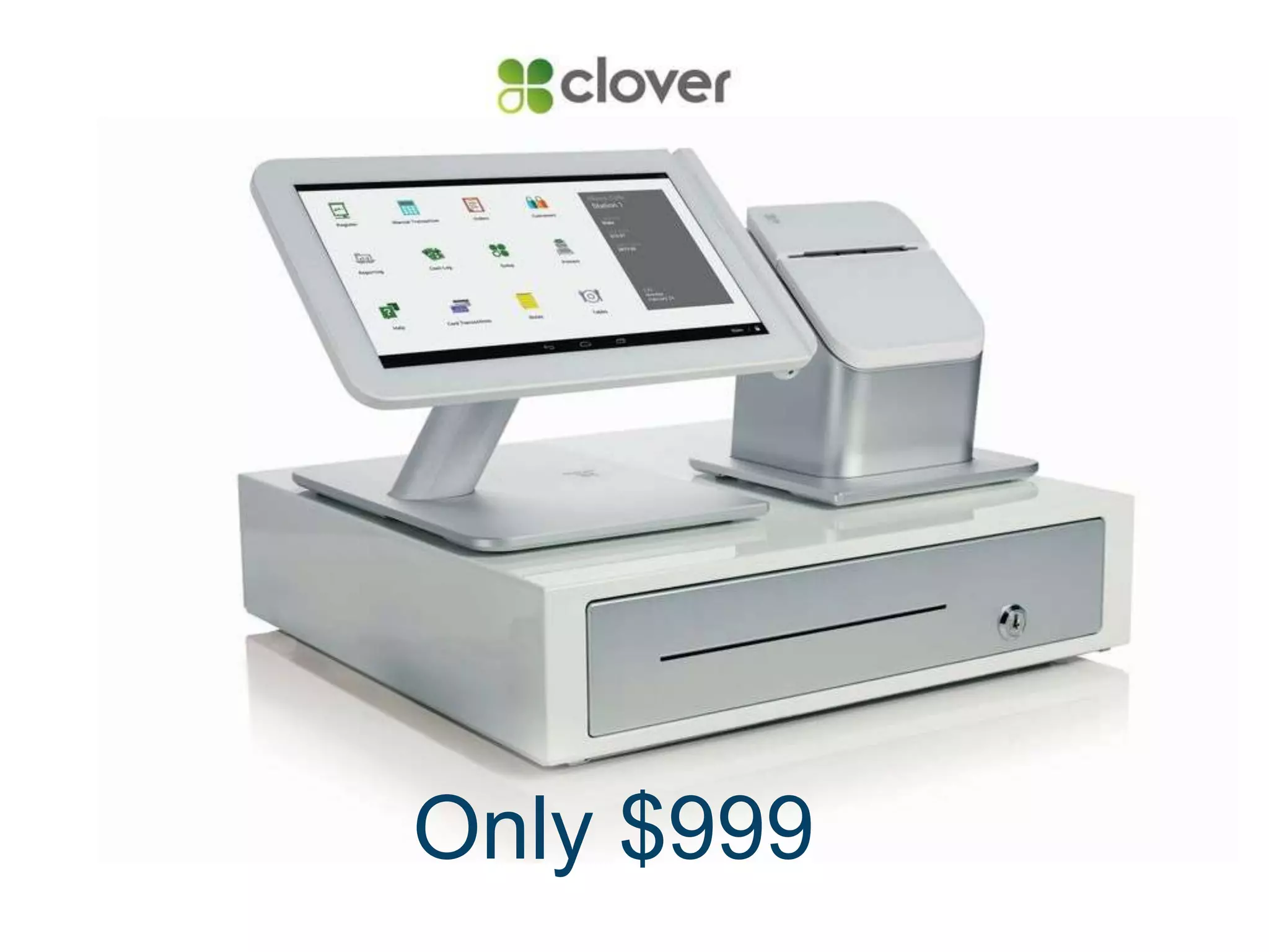 The document details the features and benefits of the Clover Station hardware and cloud-based software, designed for easy setup and intuitive use in retail and restaurant environments. It emphasizes security through transarmor® encryption and offers customization through an app market with over 2,000 developers engaged. Pricing for the system includes a monthly fee and various hardware costs, while highlighting its competitive transaction fees and lack of hidden charges.