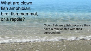 Clown fish are a type of fish that live in ocean waters like the Pacific Ocean and Great Barrier Reef. They are typically white and orange in color, have scales covering their bodies, breathe through gills, lay between 100-1000 eggs, and live near anemone in the ocean where they are cold-blooded. Clown fish are omnivores that both eat plants and animals, and protect themselves by staying near anemone.