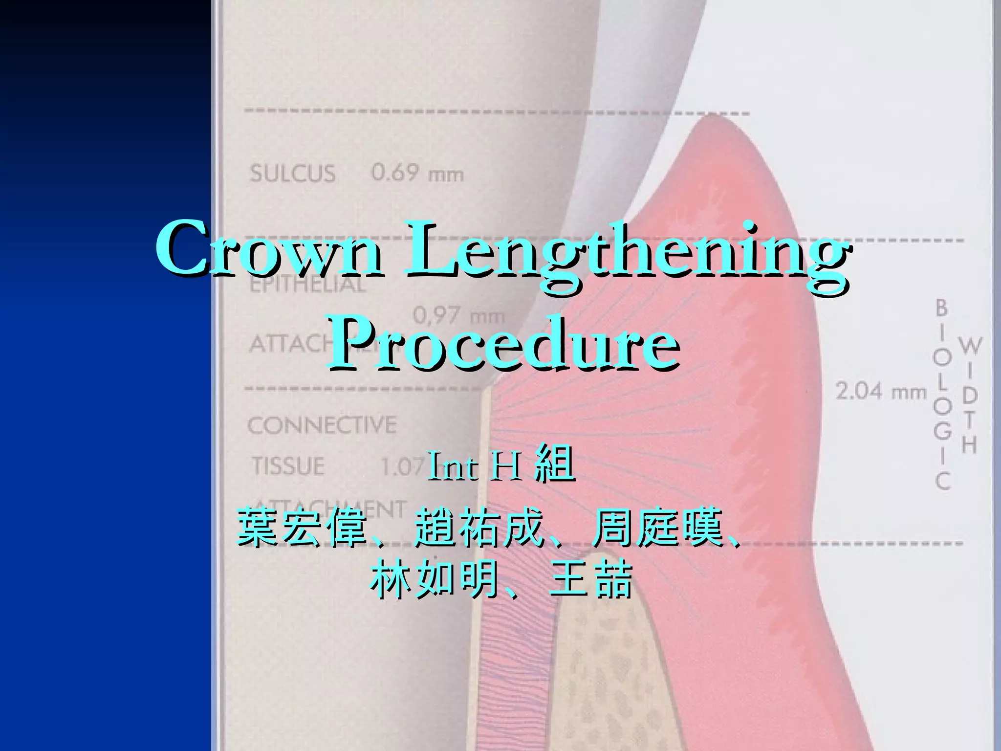 當牙齒損傷到齒槽骨脊 (Alveolar crest)時,例如深 度齲齒或斷裂所造成,而又必須作上固定假牙時: -> 侵犯 Biologic width : 牙周組織發炎、牙周囊袋形成、附連喪失 (Attachment loss) Biologic Width : 1961 Gargiulo et al. : -> Biologic width = epithelial attachment + connective tissue attachment = 0.97 mm + 1.07 mm = 2.04 mm