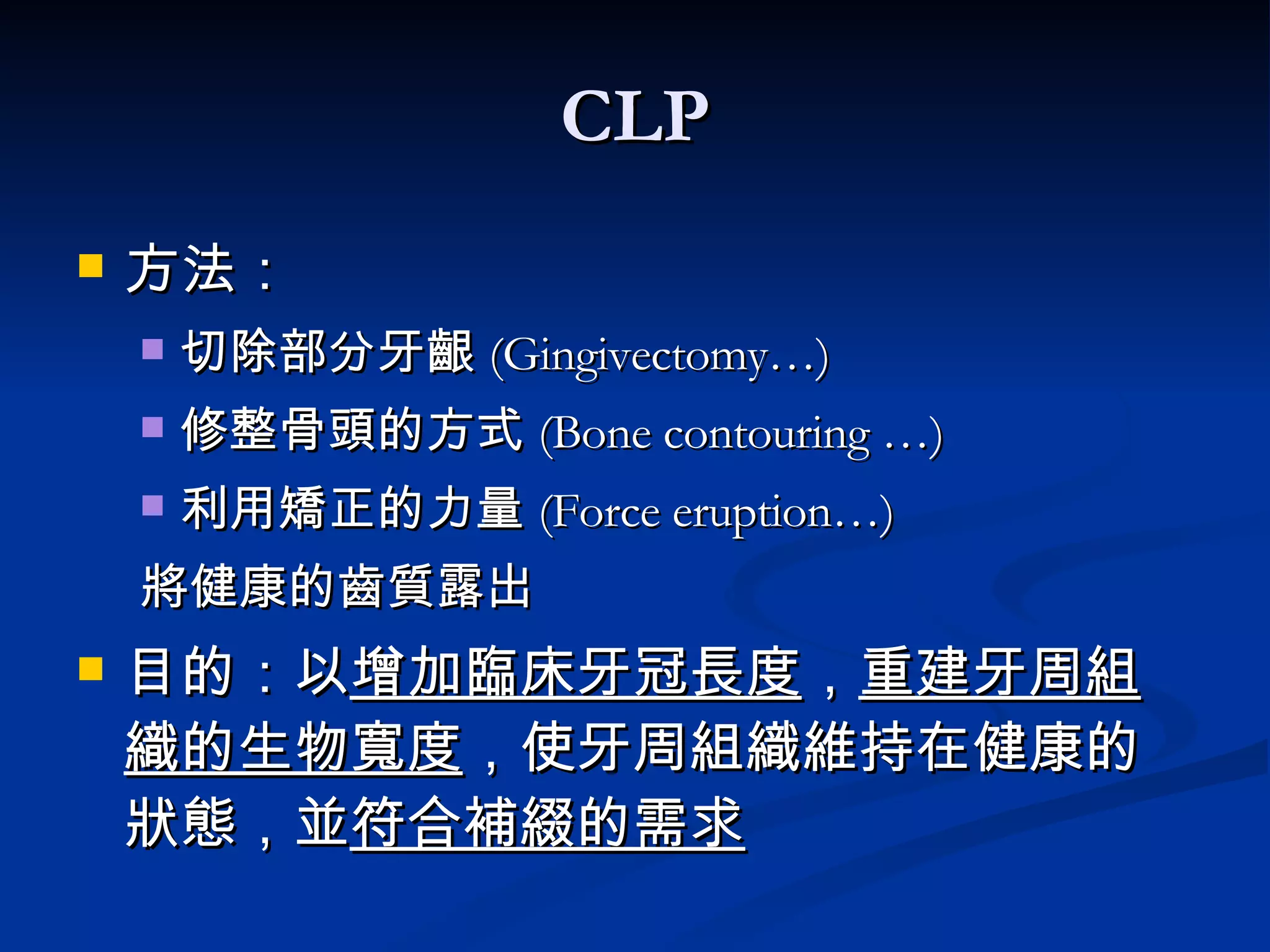 1984 Drs. Nevinsand Skurow : 若與補綴物有關,應該加上牙齦溝深度 Biologic width = 0.69mm +0.97 mm + 1.07 mm = 2.73 mm -> Biologic width 約為 3mm 左右 兩種生物寬度 (Biologic width ) 的界限考慮: 1.B.W. + 0.5 mm = 3.5 mm -> 適用於遭牙周疾病破壞,牙冠牙根比率不佳者,比 3mm 多提供 0.5mm ,來確保牙周復原後,補綴物的邊緣成 supragingival , 便於以後的磨削 2.B.W. + 1.5 mm = 4.5 mm -> 適用於牙冠齒質嚴重缺損,牙冠牙根比率佳的病例,比前一各 多 1mm ,提供圍箍效應 (ferrule effect) ,減少未來補綴物與冠心 根柱受力後旋轉脫離