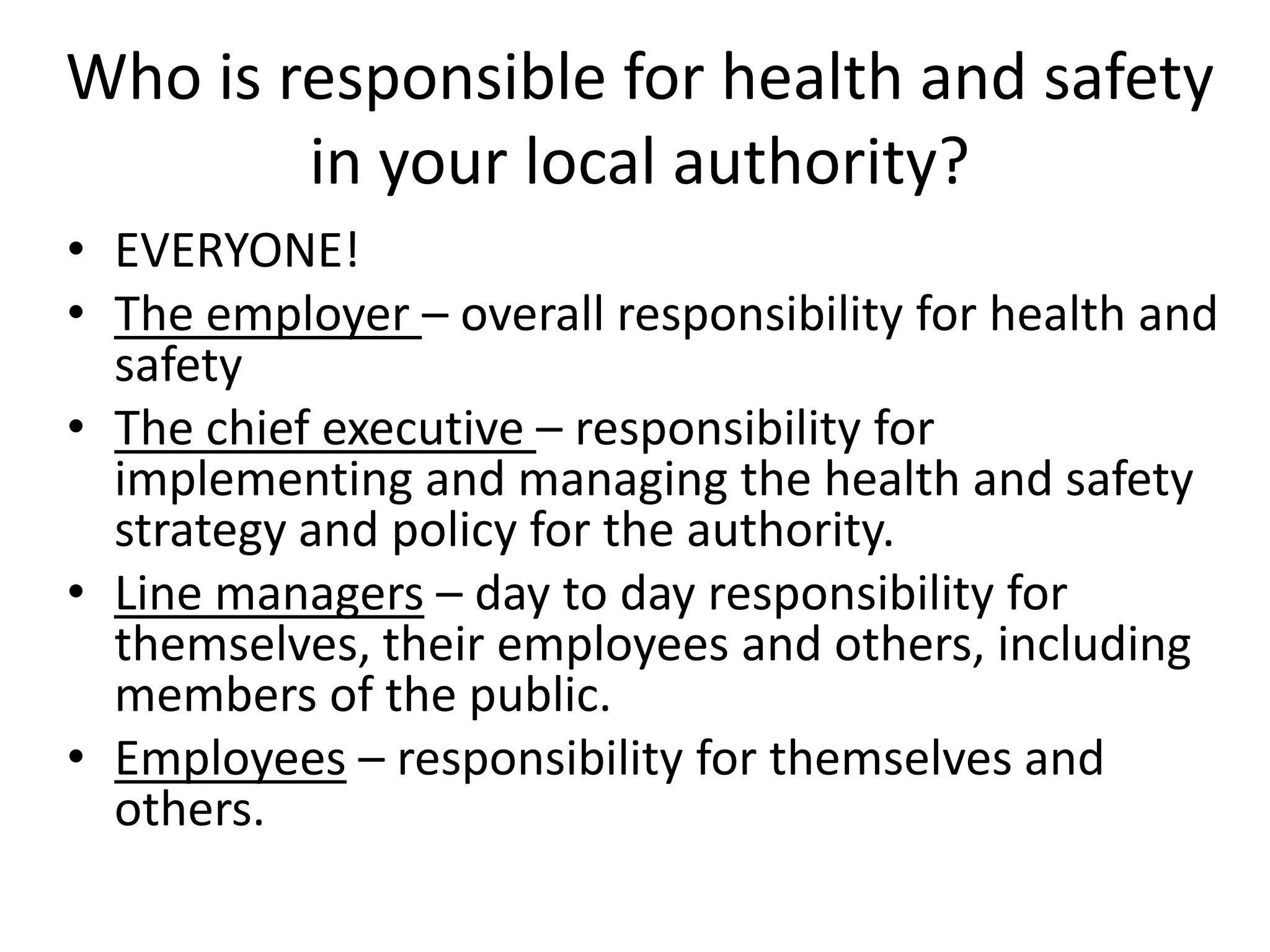 Everyone in a local authority shares responsibility for health and safety. Employers have overall responsibility, while line managers are responsible for day-to-day safety of employees and the public. If safety laws are broken and injuries occur, the authority could face prosecution, fines, and other costs like lost productivity. A good health and safety program and workplace culture that encourages continuous improvement can help authorities avoid these costs while boosting morale and efficiency. The document provides guidance on developing policies, training employees at all levels, and getting expert advice to ensure health and safety is properly managed.