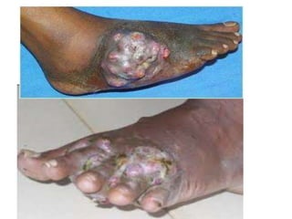 - The infection occurs after traumatic introduction of the causative agents into the skin, most often in the extremities. It progresses slowly over years and can cause extensive tissue destruction if left untreated. Diagnosis involves examination of grains discharged from sinuses for fungal or bacterial elements. Treatment involves long-term