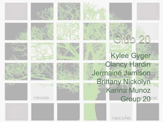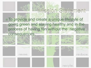 Club 20 is a proposed health-focused establishment in Flagstaff, Arizona that aims to provide a unique lifestyle experience focused on living green, staying healthy, and having fun without negative consequences. The establishment's mission is to attract customers interested in this lifestyle through organic, sustainable products and a relaxed environment. It aims to earn profits and expand to other cities within 10 years while promoting environmental awareness and healthy alternatives. Potential customers include locals, tourists, and athletes drawn by the arts, music, and outdoor recreation opportunities in Flagstaff.
