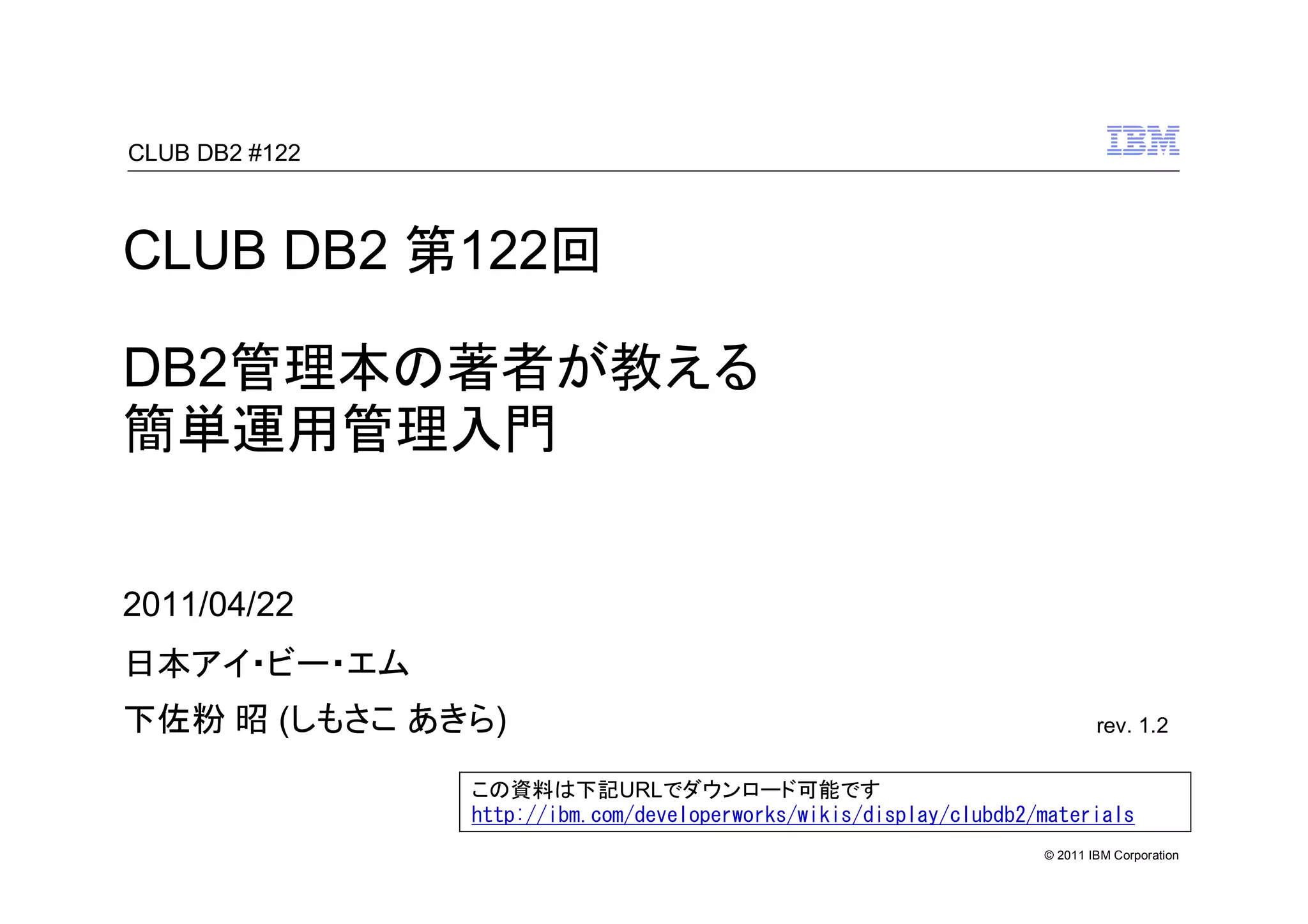 2011年4月22日 #clubdb2 の発表資料です。その他の過去資料は、以下のURLからダウンロード可能です。 http://www.ibm.com/developerworks/wikis/display/clubdb2/materials CLUB DB2はDB2の勉強会です。