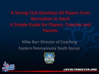 This document provides an overview of youth soccer clubs and discusses important considerations for players, coaches, and parents. It addresses different types of clubs, the role of recreation programs, goals and challenges of travel soccer, foundations of club training structures, leadership, costs, and the future of youth soccer development in the United States. The key topics covered include player development pathways, coach qualifications, balancing soccer with academics, and educating parents on realistic expectations for scholarships and professional opportunities.
