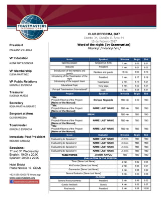 This document outlines the agenda and roles for a meeting of the Toastmasters club CLUB REFORMA. It lists the executive board members and their roles, as well as details of the meeting including times, locations, and the scheduled speakers, projects, evaluations and other segments. The meeting will take place on the 1st and 3rd Wednesdays of each month between 7-10pm at the Hotel Bristol in Mexico City and follow the standard Toastmasters format of speeches, projects, evaluations and table topics.