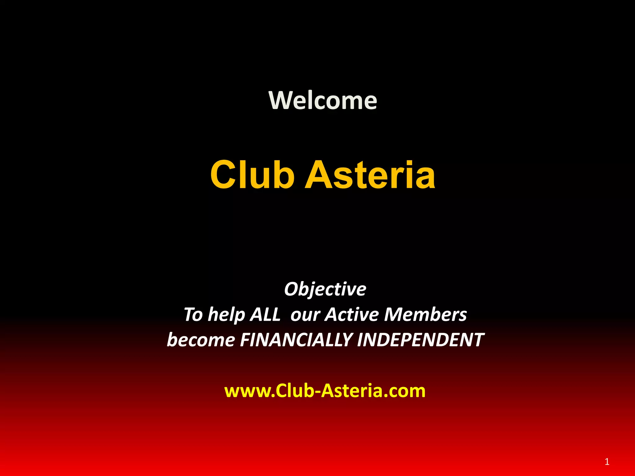 Club Asteria aims to help members achieve financial independence through multiple income streams. It promotes establishing passive income from business tools, training, and opportunities provided to gold and silver members. These members can earn up to $400 extra per week and bonuses for introducing others. The organization facilitates money transfers globally and uses a currency called Asterios to reward members weekly based on revenues from membership fees, services, and remittances. It offers leadership roles for top performers to earn higher commissions from their teams.