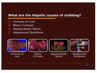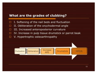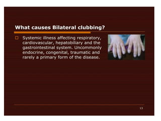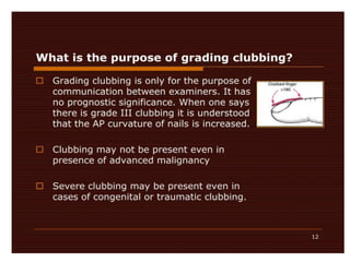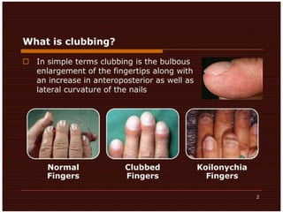 Clubbing refers to enlargement and rounding of the fingertips. Two methods are used to diagnose clubbing: the phalangeal depth ratio and digital index. A phalangeal depth ratio greater than 1 or a digital index over 10.2 indicates clubbing. The main respiratory causes of clubbing include lung cancers, mesothelioma, lung infections like bronchiectasis and cystic fibrosis, and interstitial lung diseases. Other causes include syphilis, syringomyelia, acromegaly, and thyrotoxicosis. Reverse clubbing, where the upper limbs show clubbing and lower limbs do not, can indicate transposition of the great arteries.