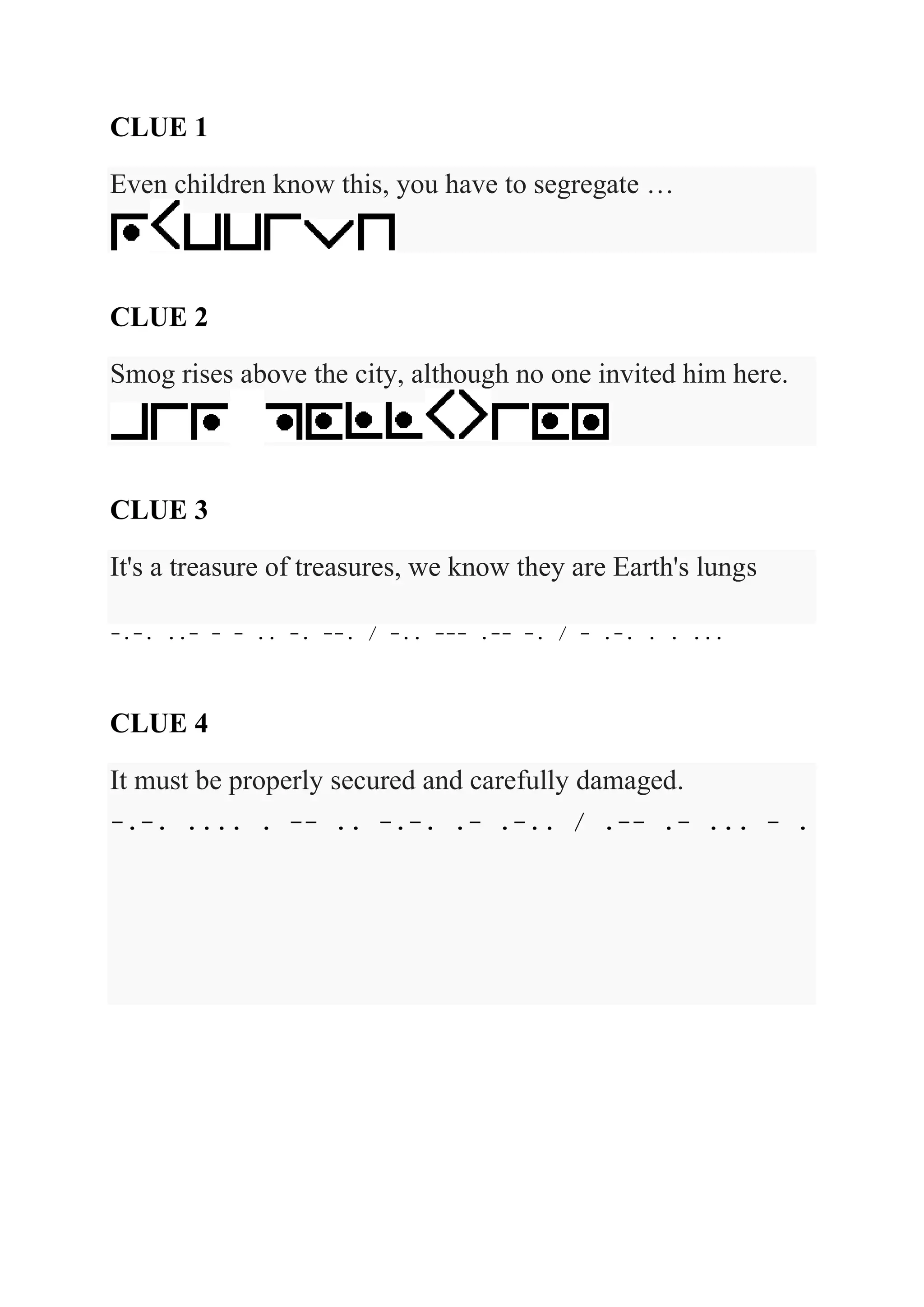 The document provides clues about nature and the environment. It refers to segregating something, smog rising above a city uninvited, and forests being called "Earth's lungs." It also mentions securing and damaging something, likely referring to protecting and harming the natural world.