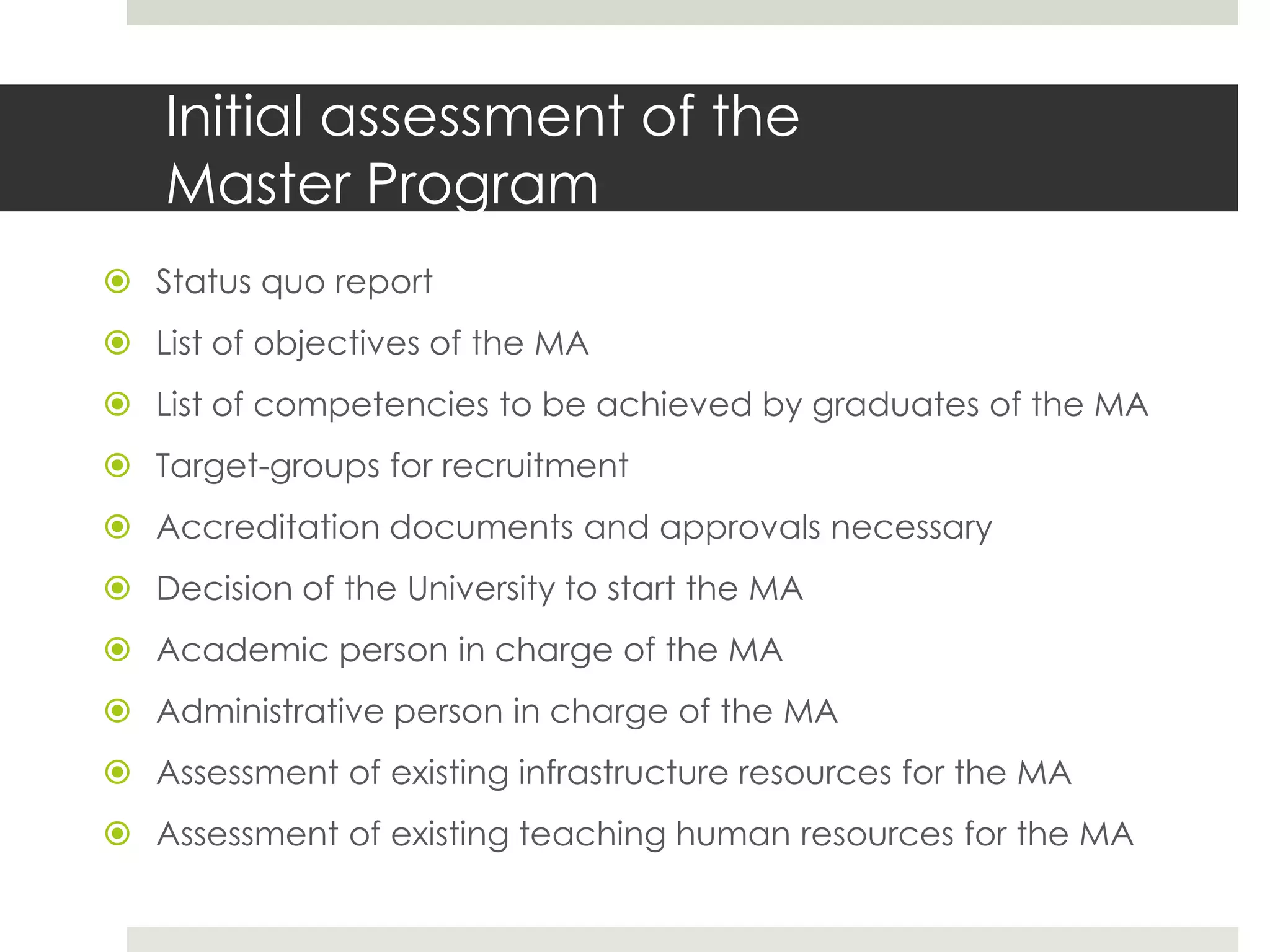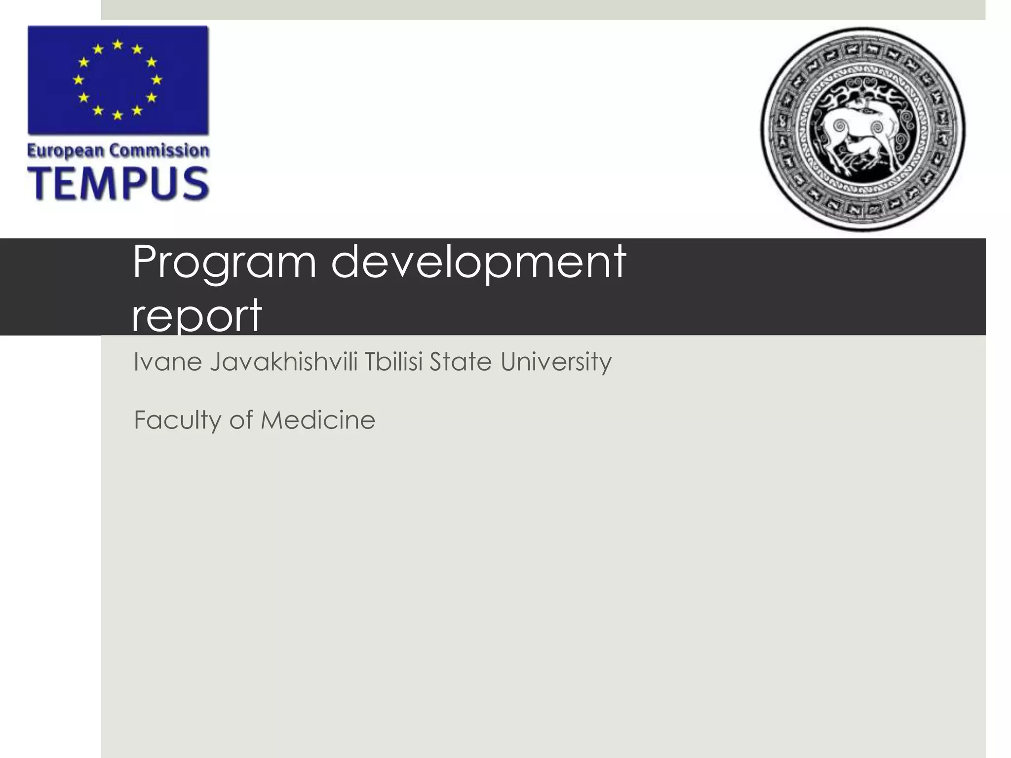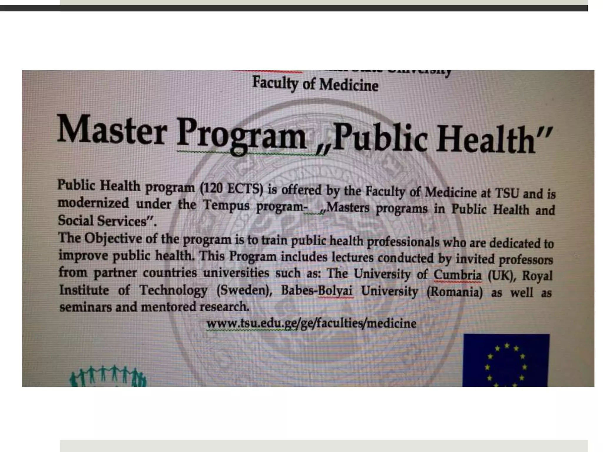 This document provides an initial assessment of a new Master's program in public health and social work at Ivane Javakhishvili Tbilisi State University. It includes an analysis of the existing curriculum and resources, lists of learning objectives and competencies, target student groups, and academic and administrative leaders. Details are given on status quo, curriculum development, teaching methods, evaluation systems, technology resources, partnerships, and trainer development opportunities. The program aims to provide advanced knowledge and skills for professional practice in social and health fields.