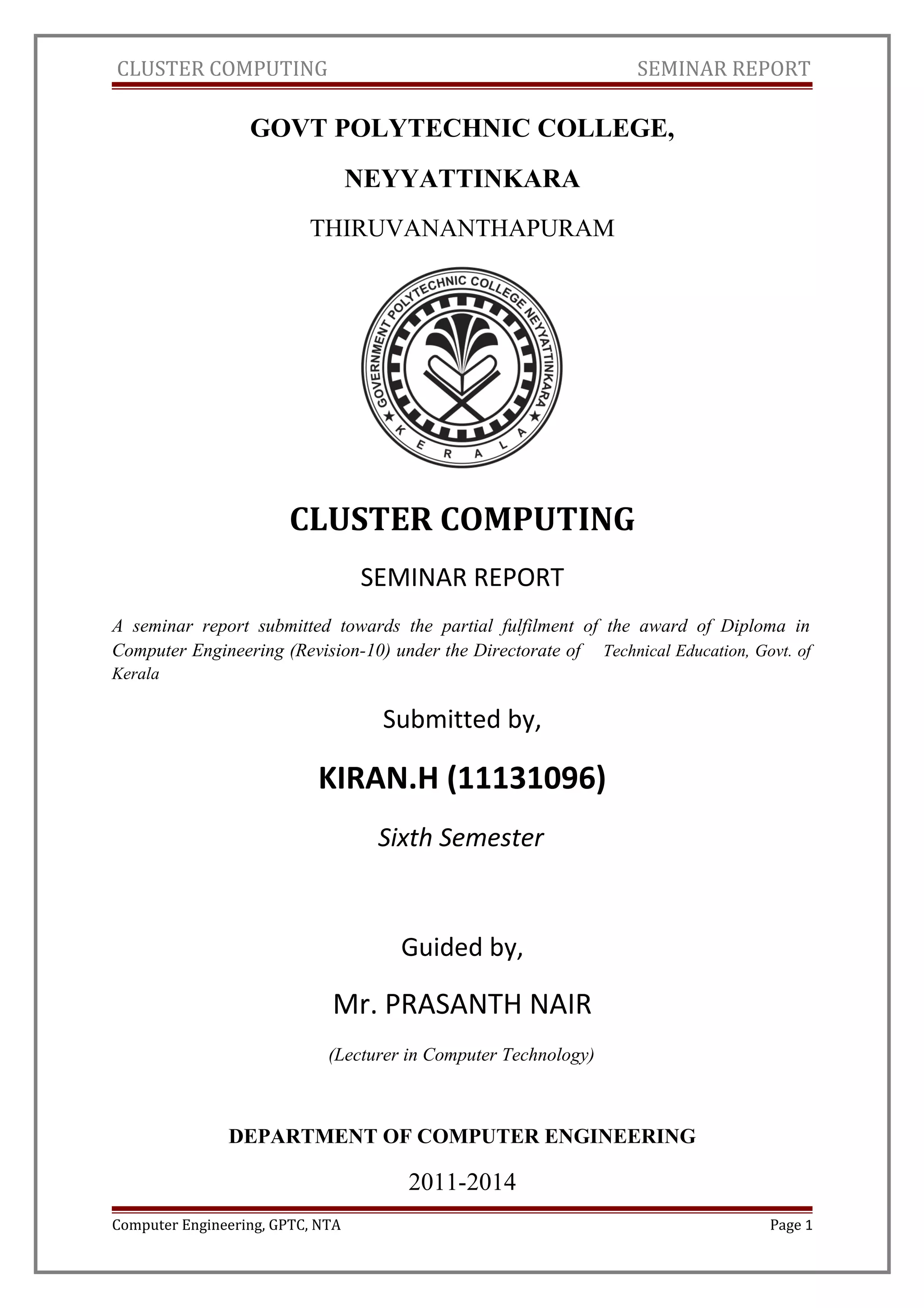 This document summarizes a seminar report on cluster computing. The report discusses cluster components including applications, middleware, operating systems, interconnects, and nodes. It describes different types of clusters such as high availability clusters, load balancing clusters, and high performance clusters. It highlights advantages like high processing capacity and disadvantages like increased difficulty of management. It provides examples of cluster applications such as Google search engines, petroleum simulation, protein exploration, and earthquake simulation.