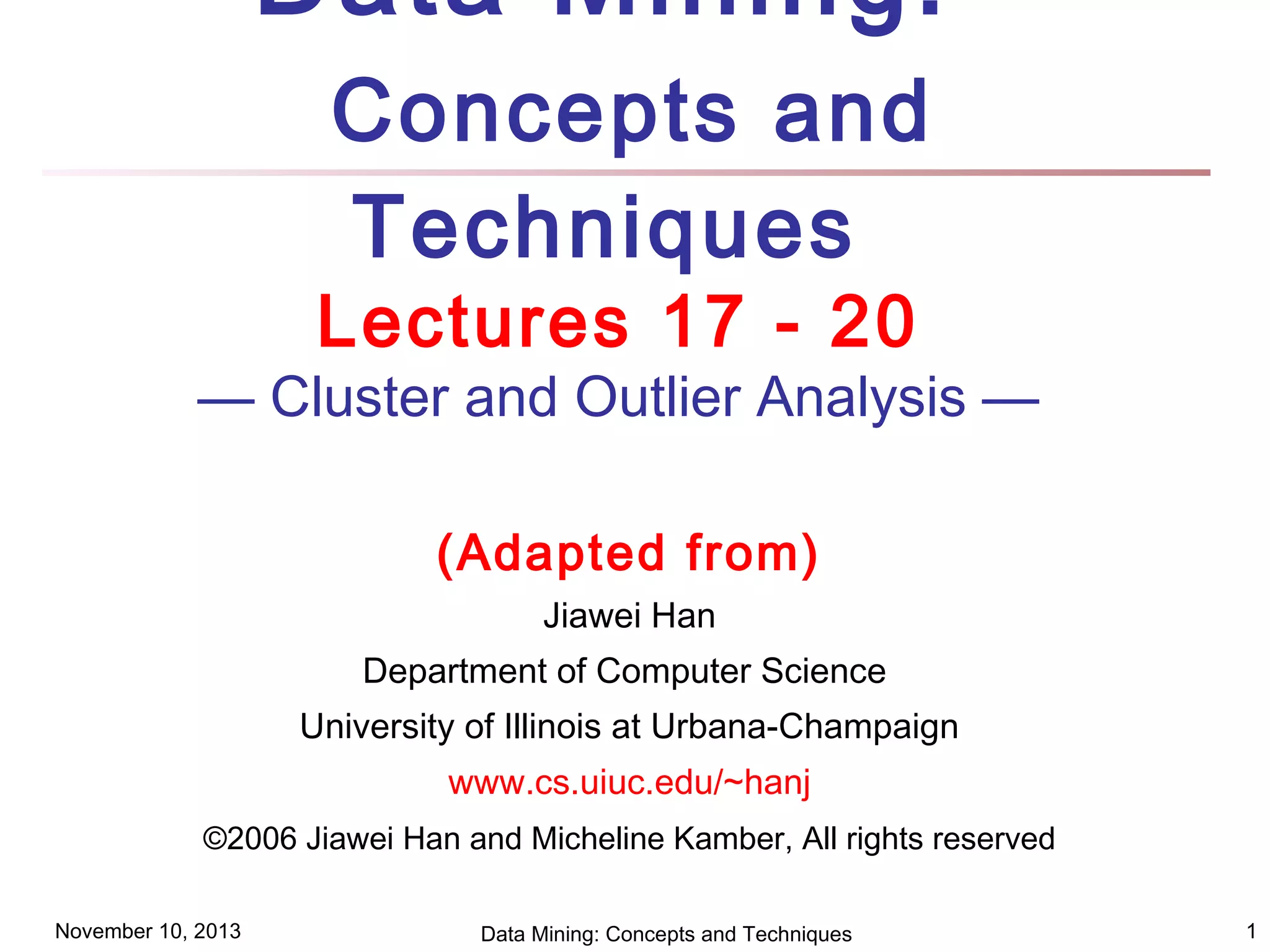 The document discusses cluster analysis and outlier analysis techniques for data mining. It covers key topics such as defining clusters and the goal of cluster analysis, different types of data that can be analyzed via clustering, major categories of clustering methods like partitioning, hierarchical, density-based, and model-based approaches. Specific clustering algorithms discussed include k-means, k-medoids, hierarchical clustering, DBSCAN, and EM. The document provides examples of clustering applications and discusses evaluating clustering quality and requirements for clustering in data mining.