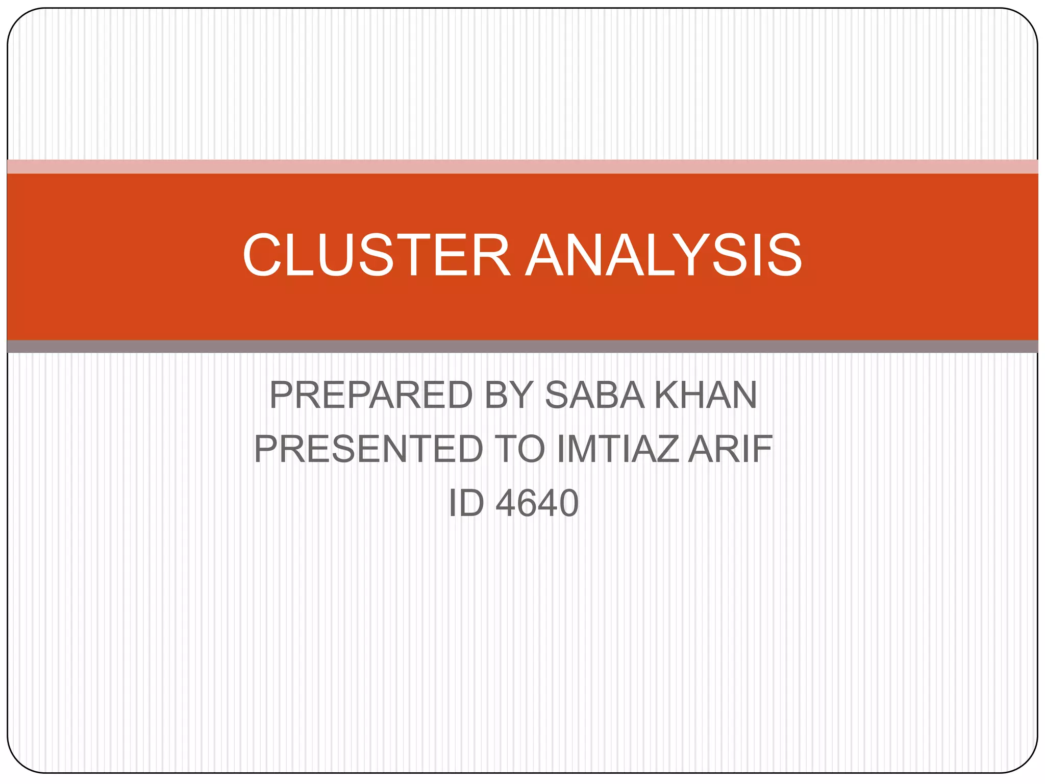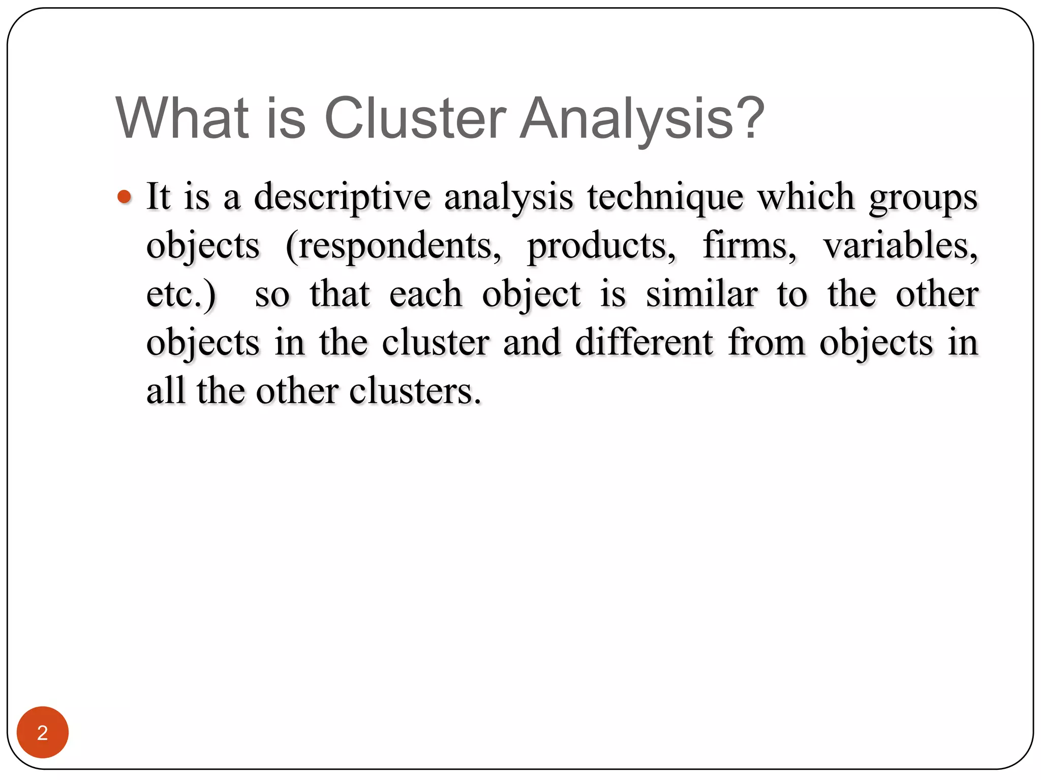 Cluster analysis is a descriptive technique that groups similar objects into clusters. It finds natural groupings within data according to characteristics in the data. Cluster analysis is used for taxonomy development, data simplification, and relationship identification. Some applications of cluster analysis include market segmentation in marketing, grouping users on social networks, and reducing markers on maps. It requires representative data and assumes groups will be sufficiently sized and not distorted by outliers.