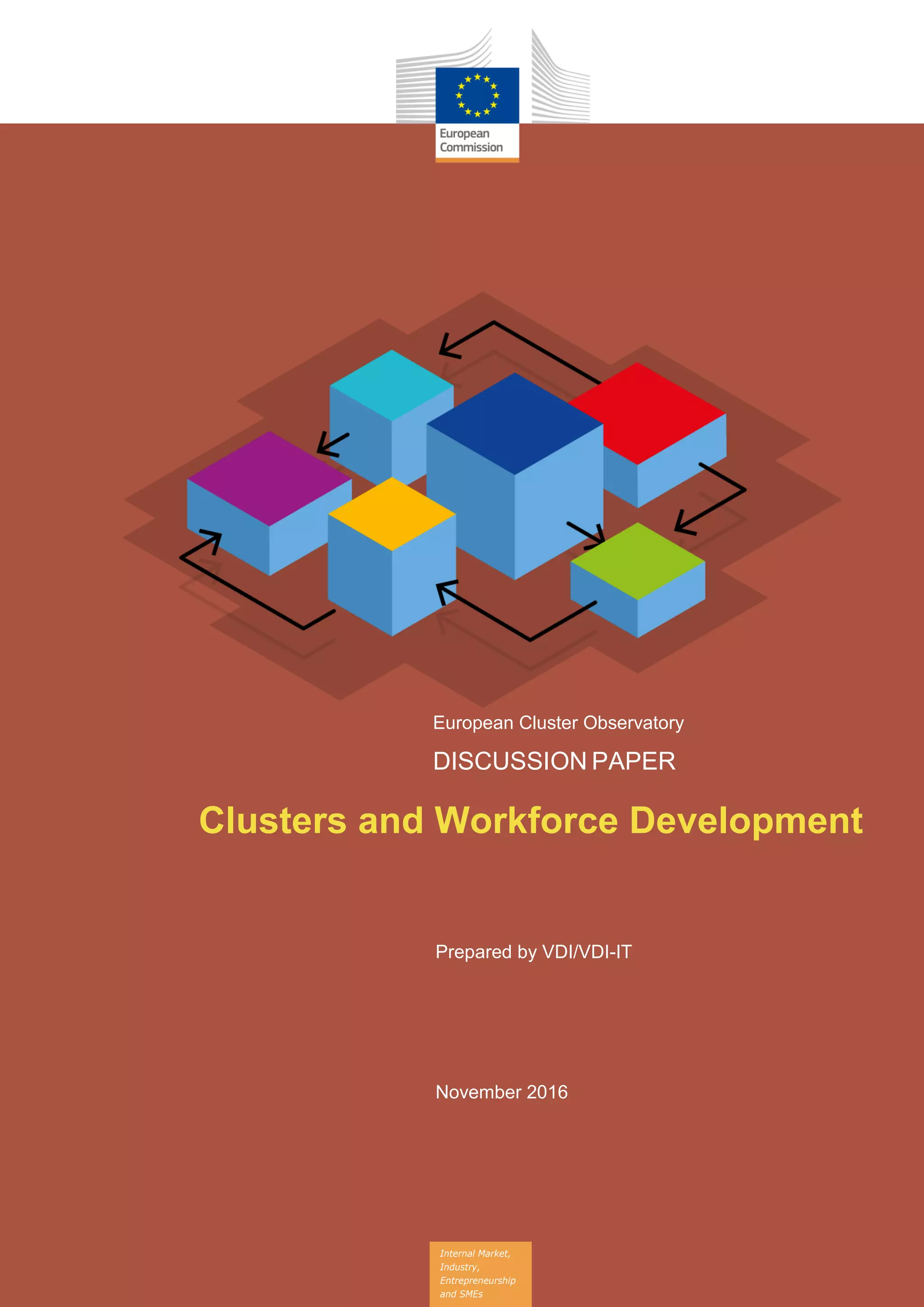 This discussion paper evaluates the role of cluster organizations in workforce development, particularly in emerging industries within Europe. It highlights the necessity of multi-stakeholder partnerships and evidence-based strategies to effectively address the evolving skills requirements of the labor market. The paper also presents various case studies and recommendations for enhancing collaboration between cluster organizations and other stakeholders in education and training.