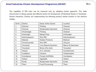 Cluster development aims to enhance the productivity and competitiveness of small and medium enterprises through economies of scale. India has over 350,000 small enterprises clustered in sectors like textiles, metals, food processing and others. Clusters provide opportunities for mutual learning, knowledge sharing and access to common facilities. However, clusters require state intervention for long-term sustainability since benefits may not be immediately visible. The Ministry of Small Scale Industries initiates various programs to promote technology upgrades, access to finance, skills and market linkages for clusters across India.