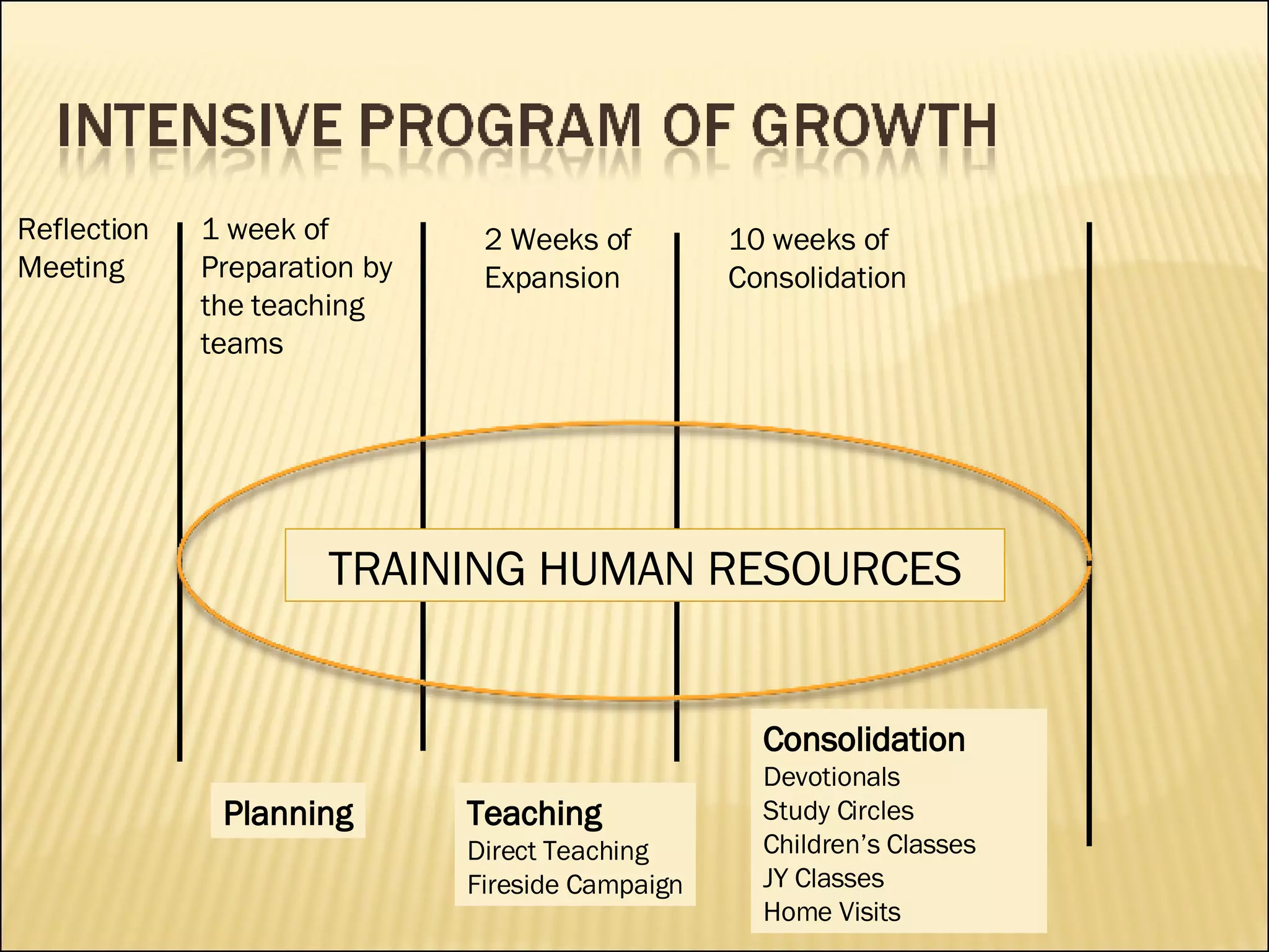 2) Activities during each phase including planning, direct teaching, devotional meetings, study circles and classes for different age groups.