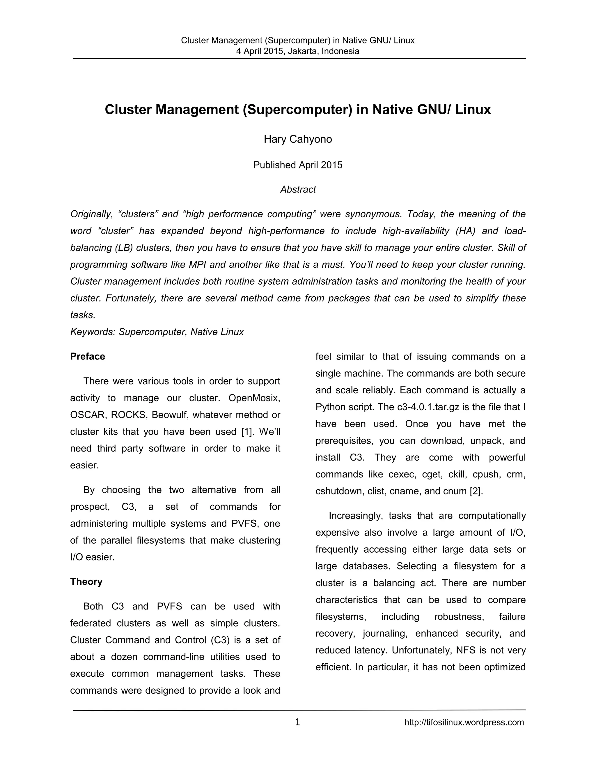 The document discusses cluster management for supercomputers using native GNU/Linux, outlining the evolution of the term 'cluster' to include high-availability and load-balancing configurations. It emphasizes the importance of managing these clusters using tools such as C3 and PVFS, which streamline tasks like system administration and file management. Despite the advantages of PVFS in alleviating bottlenecks, the document notes its limitations, such as lack of redundancy and support for certain filesystem features.