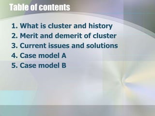 This document discusses industrial clusters through two case studies. It defines a cluster as a geographic concentration of interconnected businesses in a particular field. The semiconductor industry in Silicon Valley and the automobile industry in Detroit are provided as historical examples of successful clusters. Benefits of clusters include access to resources, information, institutions, customer needs and technology. Potential downsides are homogeneousness, monopolization and high business costs. Current issues facing clusters include lack of knowledge sharing, liquidity and government support. Solutions proposed are strong leadership, start-up support, open innovation and collaboration between government, institutions, universities and companies. Case studies of the Tsukuba Science City cluster in Japan and the Silicon Valley cluster in the US are then described.