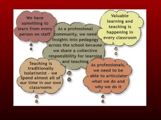 The document outlines an agenda for a leadership development workshop focusing on building sustainable school leadership skills. It discusses principles of sustainability like depth, breadth, and justice. It provides models for quality professional dialogue including quality learning circles and a pedagogy coaching model. It also addresses having tough conversations and developing issue identification and prioritization strategies.