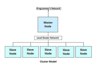 This document discusses low cost supercomputing using Linux clusters. It begins with an introduction to parallel processing and clustering. Clusters offer a way to use multiple computers together as a single system for higher performance and lower costs. The document then covers parallel processing schemes and provides a conceptual overview of clusters. It discusses cluster design considerations including topology, hardware specifications, and software requirements. Linux is identified as a suitable operating system for clustering. The document outlines features and benefits of clustering, such as data sharing and parallel processing. It provides examples of clustering applications in fields like web serving, simulation, and science.