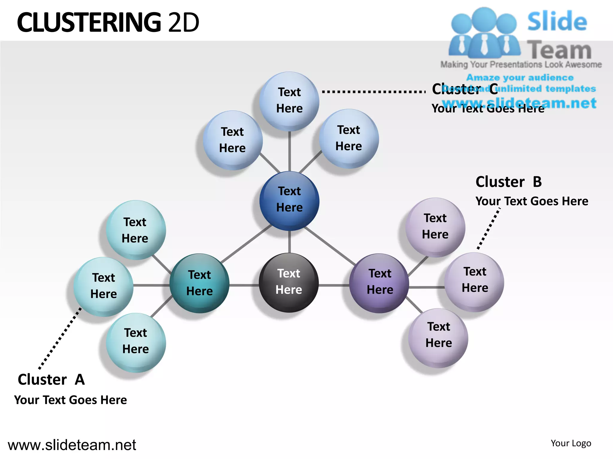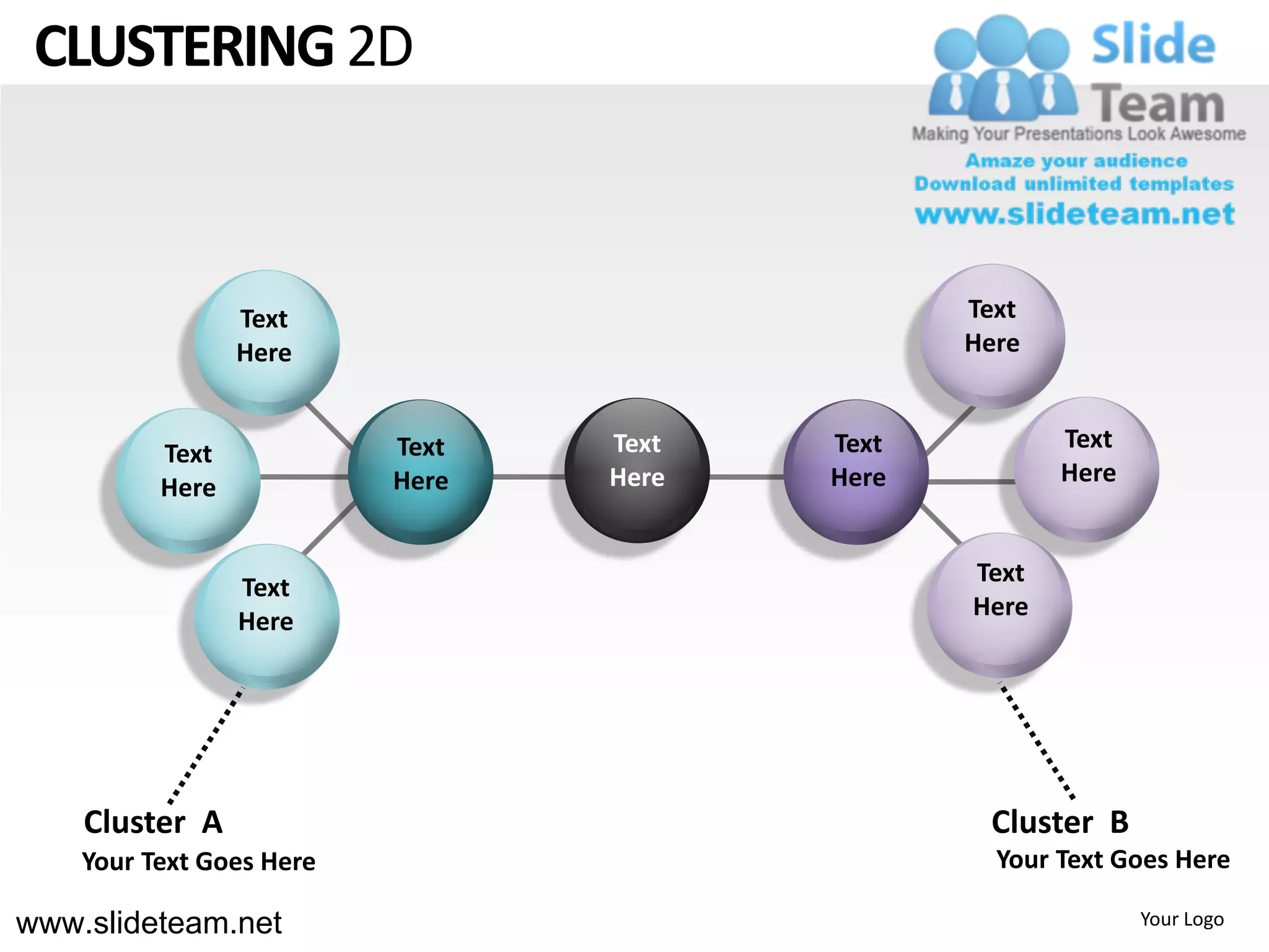 The document discusses clustering 2D objects into groups. Text objects are arranged on a slide and clustered together based on their proximity. The clusters are labeled A, B, C, etc. Additional slides show more complex arrangements of text objects clustered in different configurations.