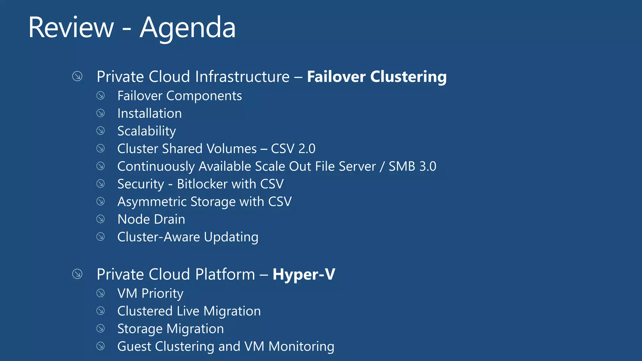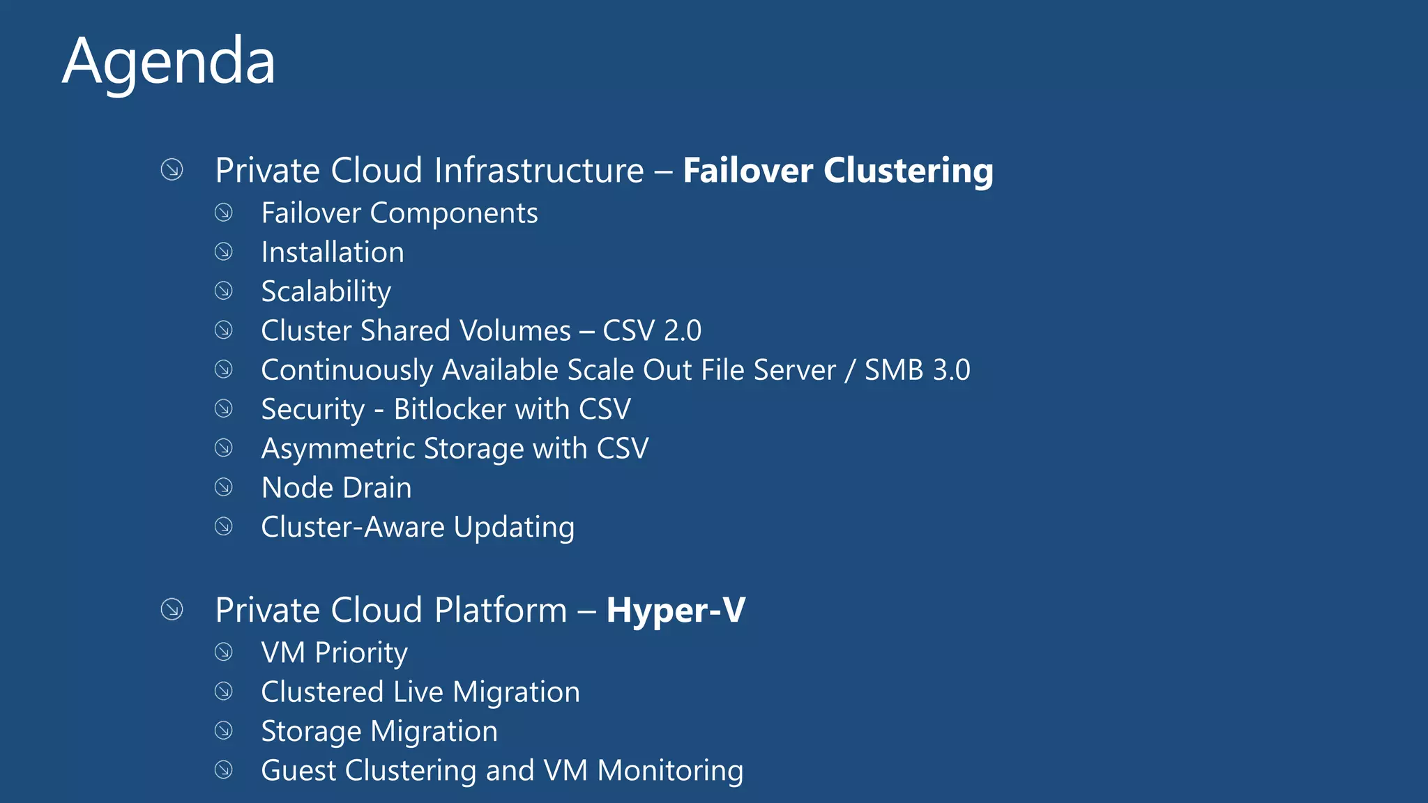 The document discusses enhancements for managing private cloud infrastructure on the Hyper-V platform, focusing on cluster management, scalability, and storage solutions. It outlines features such as task scheduling, streamlined maintenance, and virtual machine mobility, allowing for efficient resource utilization and minimal downtime. Powershell cmdlets are highlighted as tools to simplify management tasks within the clustered environment.