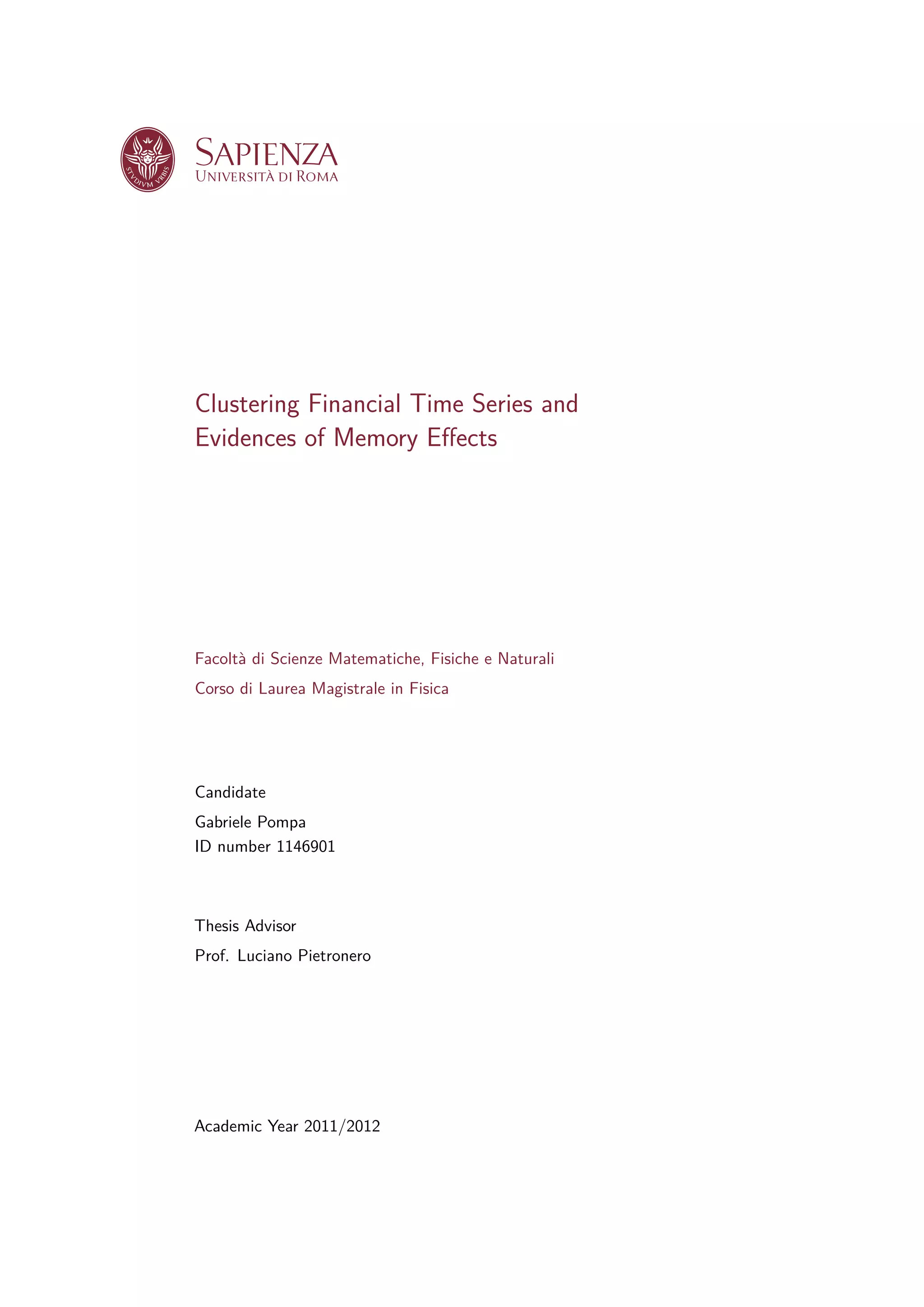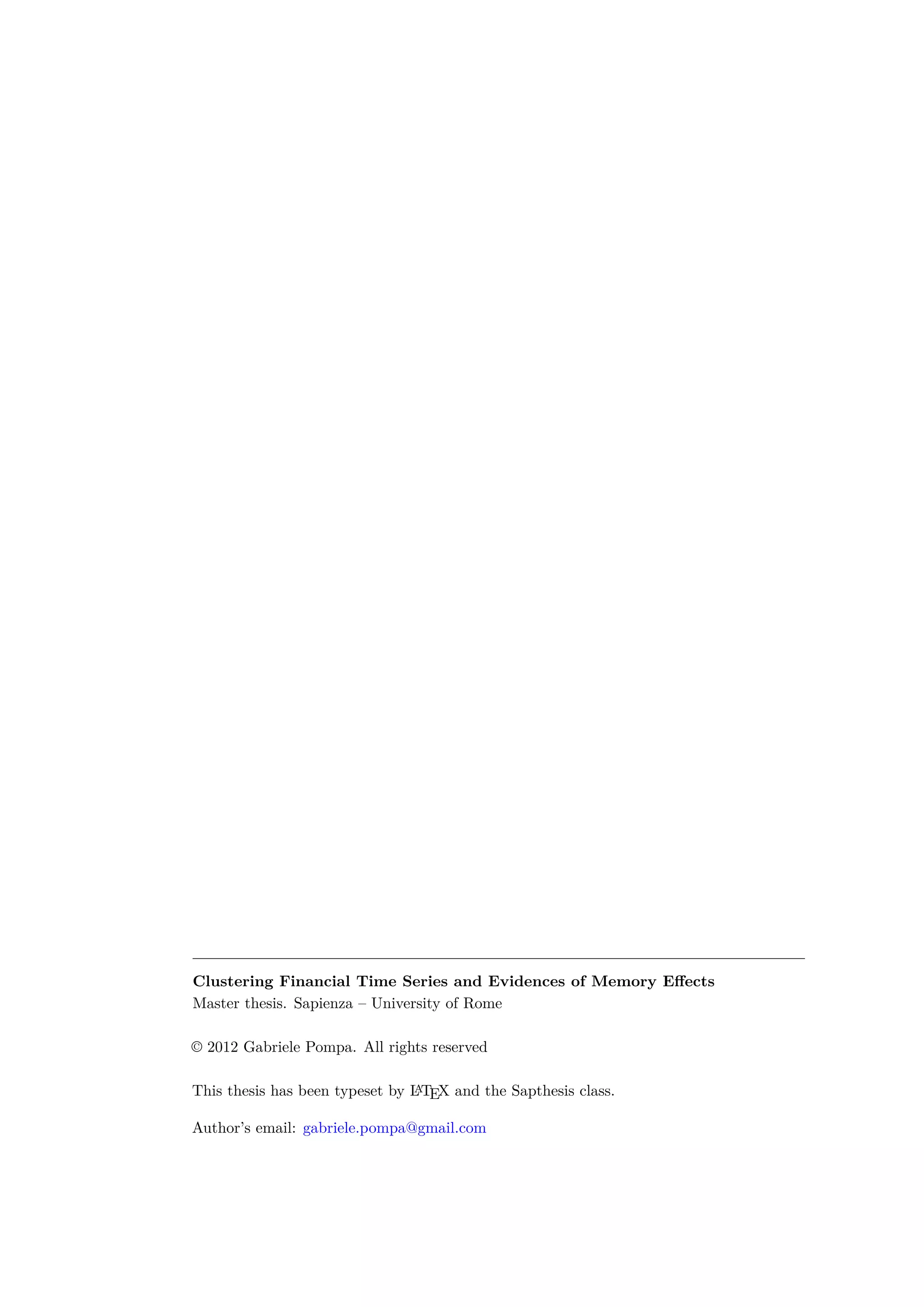 This document is a thesis that examines clustering and memory effects in financial time series. It begins with an introduction to relevant concepts in financial markets like the efficient market hypothesis and random walk models. It then discusses pattern recognition techniques like clustering and explores their application to time series data. The document outlines the Monte Carlo framework used in simulations. It analyzes memory effects through a "bounce" study of support and resistance levels. It presents an original Bayesian clustering algorithm applied to toy and real financial data. The results provide evidence of structural regularities among the time series analyzed.