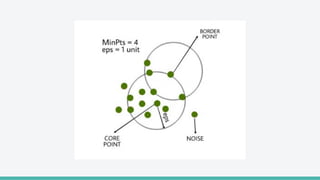 The document provides an overview of clustering in machine learning, focusing on unsupervised learning techniques that analyze unlabeled data to discover patterns, particularly through clustering algorithms like k-means and hierarchical clustering. It covers the applications of clustering in various fields such as retail, marketing, and medicine, while also discussing methods to determine the optimal number of clusters and practical considerations during implementation. Additionally, it addresses alternative clustering methods like k-medoids and DBSCAN, highlighting their strengths and characteristics.