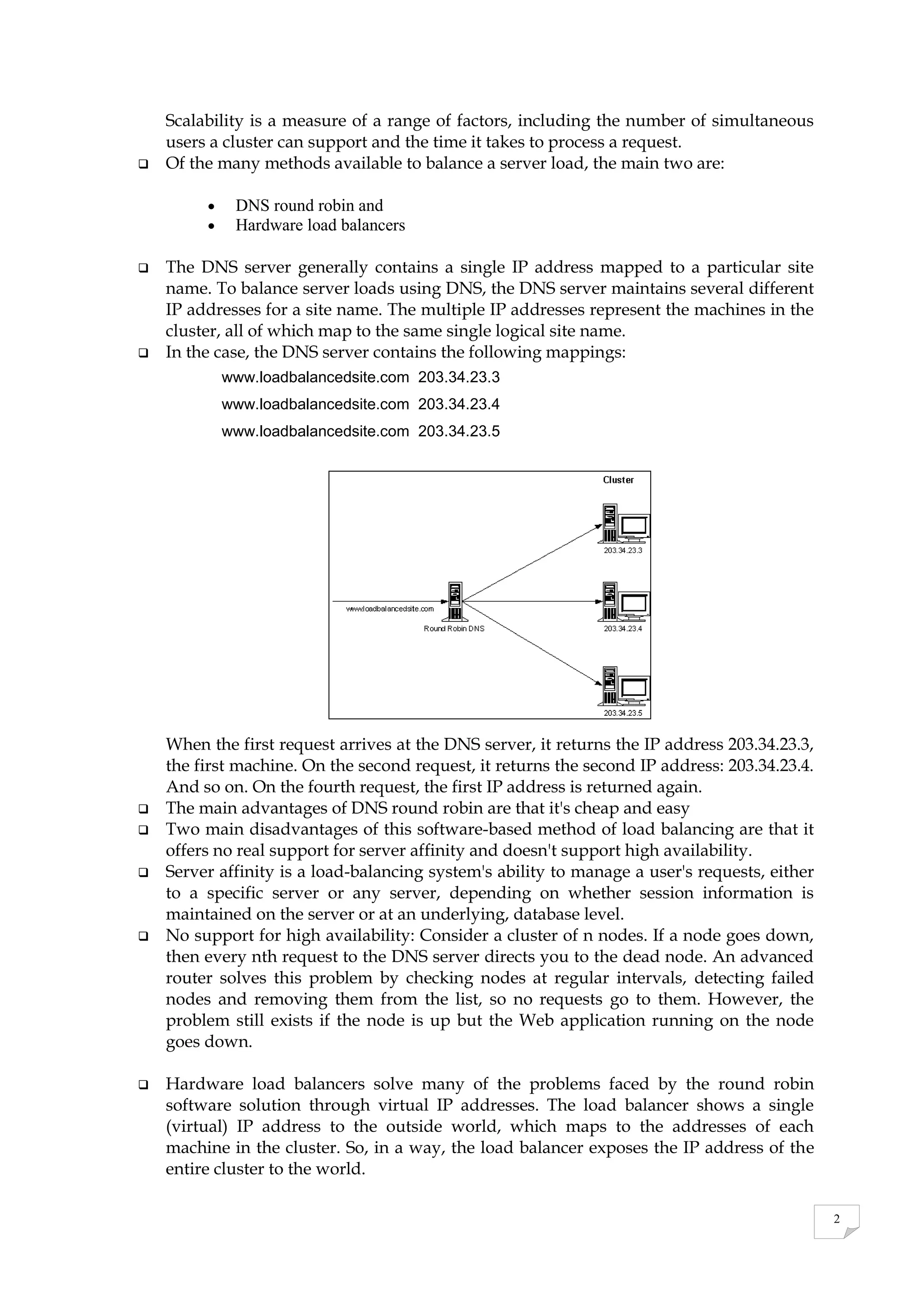 A cluster is a group of machines that work together to provide services like load balancing. Clusters can include load balancers, web servers, routers, switches, firewalls, and databases. Load balancing distributes requests across servers in a cluster to optimize performance and availability. Common load balancing methods are DNS round robin, which distributes IP addresses, and hardware load balancers, which provide a single virtual IP address for the cluster. Hardware load balancers offer high availability and can maintain sessions across servers.