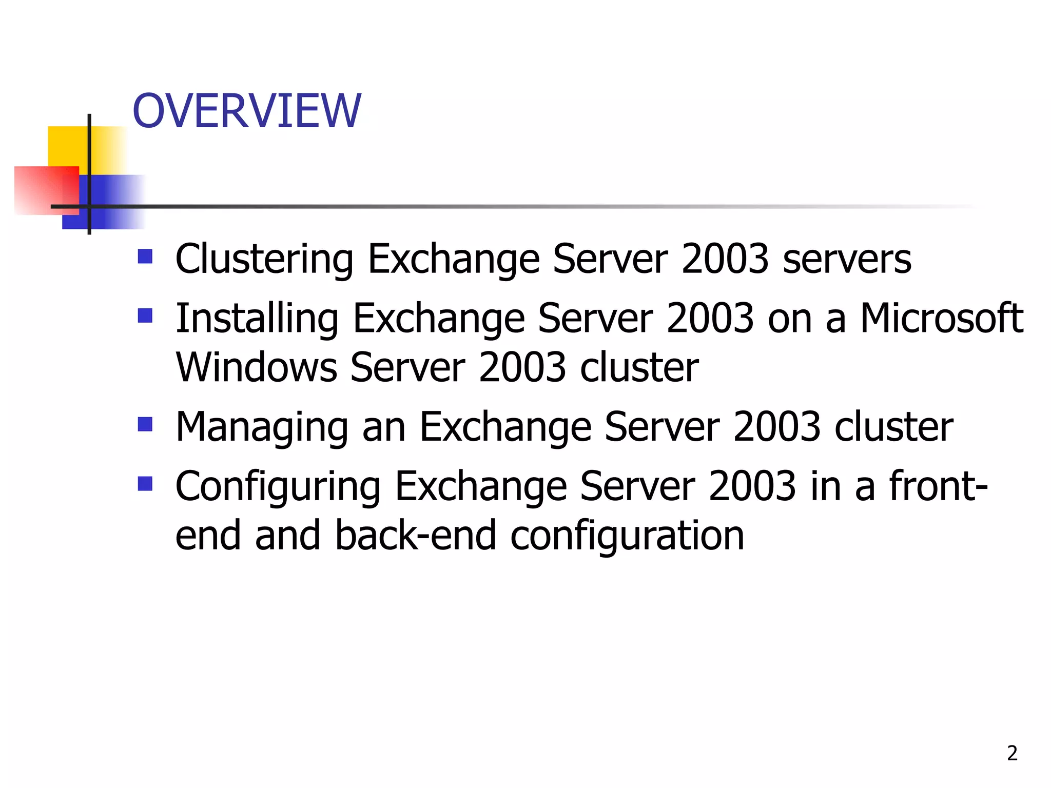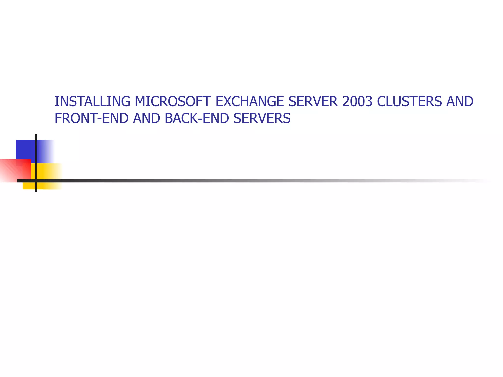 This document discusses installing and configuring Microsoft Exchange Server 2003 in clustered environments. It describes setting up Exchange Server 2003 on Windows Server 2003 clusters using the Microsoft Cluster service or network load balancing. It also covers configuring Exchange Server 2003 with front-end servers that route internet traffic to back-end servers hosting mailboxes and data.