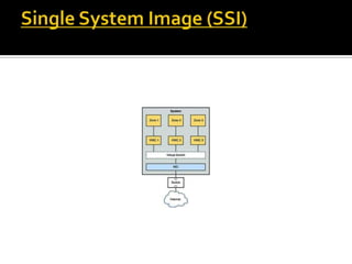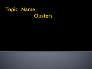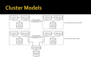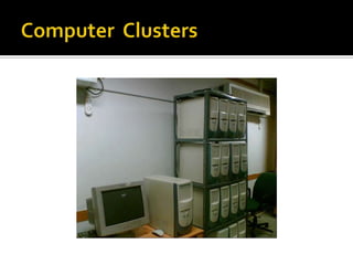 The document discusses computer clusters, which involve linking multiple computers together to work as a single logical unit. Key points include: clusters allow for cost-effective high performance and availability compared to single systems; they can be configured in shared-nothing or shared-disk models; common applications include scientific computing, databases, web services, and high availability systems; and cluster middleware helps provide a single system image and improved manageability.